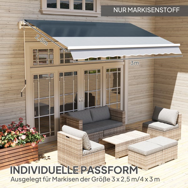 Deine alte Markise sieht nicht mehr so frisch aus? Kein Problem! Dieser hochwertige Ersatzstoff bringt neuen Schwung auf deine Terrasse oder deinen Balkon. Aus robustem 280g Polyester gefertigt, ist er komplett wetterfest und bietet super Sonnenschutz. Das coole Grau passt zu fast allem und der praktische Volant gibt dem Ganzen noch das gewisse Etwas. Einfach den alten Stoff abmachen und diesen neuen draufziehen - schon hast du wieder einen gemütlichen Schattenplatz! Perfekt für Cafés, Restaurants oder einfach für deine eigene Wohlfühl-Oase daheim. Übrigens: Nur der Stoff wird geliefert, das Gestell ist nicht dabei. Aber wenn du schon ein Markisengestell hast, ist das die perfekte Aufrüstung! Genieße den Sommer im Schinen - mit diesem qualitativ hochwertigen Markisenstoff.