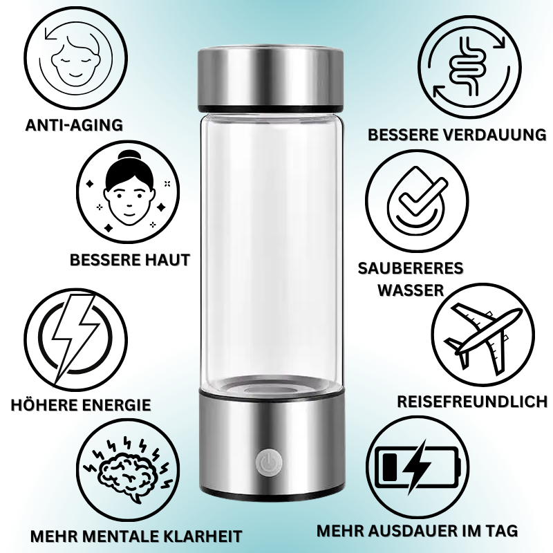 Trinkwasser der nächsten Generation - für mehr Energie und Wohlbefinden! Die HydroVive Wasserflasche verwandelt normales Leitungswasser in nur 3 Minuten in gesundes, wasserstoffreiches Wasser. Die fortschrittliche Technologie erzeugt kleine Bläschen, die du durch das transparente Design live beobachten kannst. Aus rostfreiem Stahl und BPA-freiem Glas - absolut sicher und geschmacksneutral. Perfekt für unterwegs: leicht, tragbar und mit praktischem USB-Ladegerät. Ob im Büro, beim Sport oder auf Reisen - du hast immer gesundes Wasser dabei. Die Wasserstoff-Anreicherung soll positive Effekte auf deine Gesundheit haben. Einfache Bedienung, stylisches Design und innovative Technologie - mach dein Trinkwasser zum Gesundheitsbooster!
