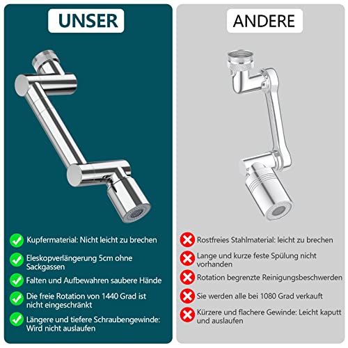Mehr Komfort am Waschbecken! Dieses praktische 2er-Set mit 360° drehbaren Wasserhahnverlängerungen macht jede Armatur vielseitiger. Jeder Extender ist 14cm lang und aus rostfreiem Metall mit galvanisierter Oberfläche. Perfekte 360° Drehung für vollständige Abdeckung des Waschbeckens - keine toten Winkel mehr! Zwei Wassermodi: Sanfter Schaumstrahl für schonendes Reinigen und kräftige Druckdusche für intensive Reinigung. Spart dabei Wasser durch gezieltere Anwendung. Einfache Installation ohne Werkzeug dank innovativer Gewindekonstruktion. Inklusive 2 Adapter und Anti-Rutsch-Dichtungen für perfekten Halt. Passt auf die meisten Standardarmaturen in Küche, Bad, Toilette oder Balkon. Ideal für Familien, um Kindern das Händewaschen zu erleichtern, oder für die gezielte Reinigung von Obst, Gemüse oder Geschirr. Mach deine Armatur zum Allrounder mit diesem cleveren Set!