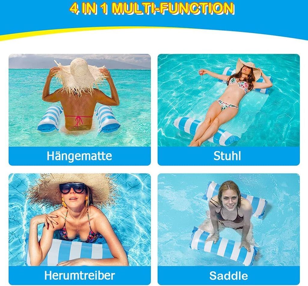 Spaß pur im Wasser! Diese vielseitige Wassermatratze verwandelt sich in 4 verschiedene Spielmöglichkeiten: Hängematte, Sportsattel, Liege oder Drifter. Mit 130x80cm Größe bietet sie genug Platz für Erwachsene und hält bis zu 100kg aus. Das Mesh-Netz sorgt für zusätzlichen Komfort und Stabilität. Aus robustem PVC-Material das nicht leicht reißt oder Luft verliert. Einfach mit der beiliegenden Pumpe aufblasen und schon geht's ab ins kühle Nass! Perfekt für Pool, See oder Meer. Aber Achtung: Kinder nur unter Aufsicht verwenden! Mach deinen Badeausflug zum unvergesslichen Erlebnis!