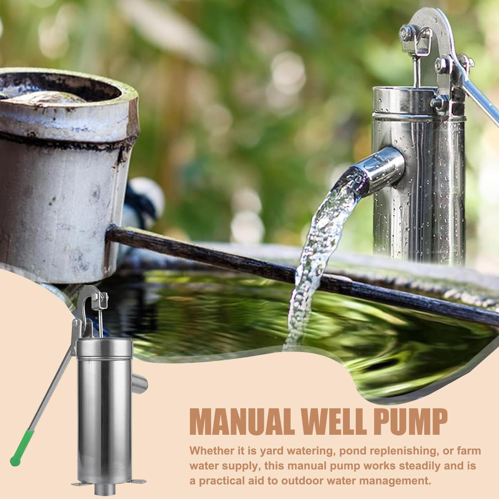 Wasser marsch - ganz ohne Strom! Diese robuste Handschwengelpumpe aus Edelstahl ist die perfekte Lösung für Garten, Hof oder Notfälle. Mit dem 46cm langen, ergonomischen Griff lässt sich Wasser mühelos aus Brunnen, Flüssen oder Tanks fördern - bis zu 8 Meter Tiefe! Das verbesserte Kolbendesign sorgt für effiziente Wasserförderung und der verstärkte Griff verformt sich auch bei häufigem Gebrauch nicht. Rostbeständig und verschleißfest hält die Pumpe vielen Jahren stand. Im Lieferumfang sind alle Montageteile enthalten: 3 Ledermanschetten, Dichtungen, Schrauben, Isolierband, PVC-Anschlussstück und Adapter. Einfach zusammensetzen und sofort einsatzbereit! Perfekt zur Gartenbewässerung, Tierpflege oder als Notfall-Wasserquelle. Ob auf dem Bauernhof, beim Camping oder im eigenen Garten - diese Pumpe liefert zuverlässig Wasser, wann immer du es brauchst. Einfach pumpen und sich über frisches Wasser freuen!