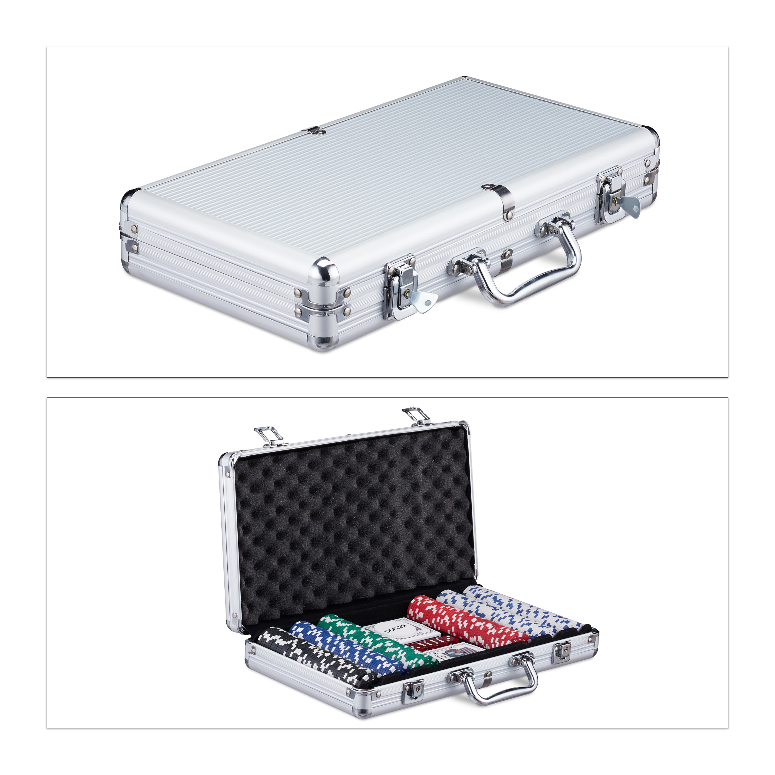 Alles sicher verstaut im stabilen Aluminiumkoffer (39,5x21x6,5 cm). Enthalten: 2 Kartendecks (108 Karten), 5 Würfel, 1 Dealer Button und 2 Schlüssel.