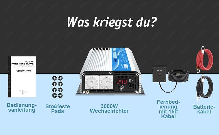 Für alle, die unterwegs nicht auf Komfort verzichten wollen! Dieser TAGEEBLU Wechselrichter verwandelt 24V Gleichstrom aus deiner Batterie in 230V Wechselstrom - mit satten 3000W Dauerleistung und bis zu 6000W Spitzenleistung! Die reine Sinuswelle sorgt dafür, dass auch empfindliche Geräte wie Laptops, Kühlschränke und Fernseher problemlos laufen. Mit 92% Wirkungsgrad und weniger als 10W Leerlaufverbrauch ist er super effizient. Der intelligente Chip bietet 7-fachen Schutz gegen Überlastung, Überspannung und Kurzschluss. Zwei EU-Steckdosen ermöglichen den Betrieb mehrerer Geräte gleichzeitig. Perfekt für Wohnmobile, Camping, Boote oder als Notstromversorgung. Mit LCD-Display siehst du immer den aktuellen Status. Einfach anschließen und schon kannst du im Freien deine Haushaltsgeräte nutzen!