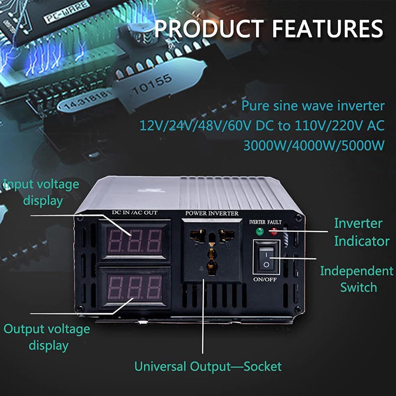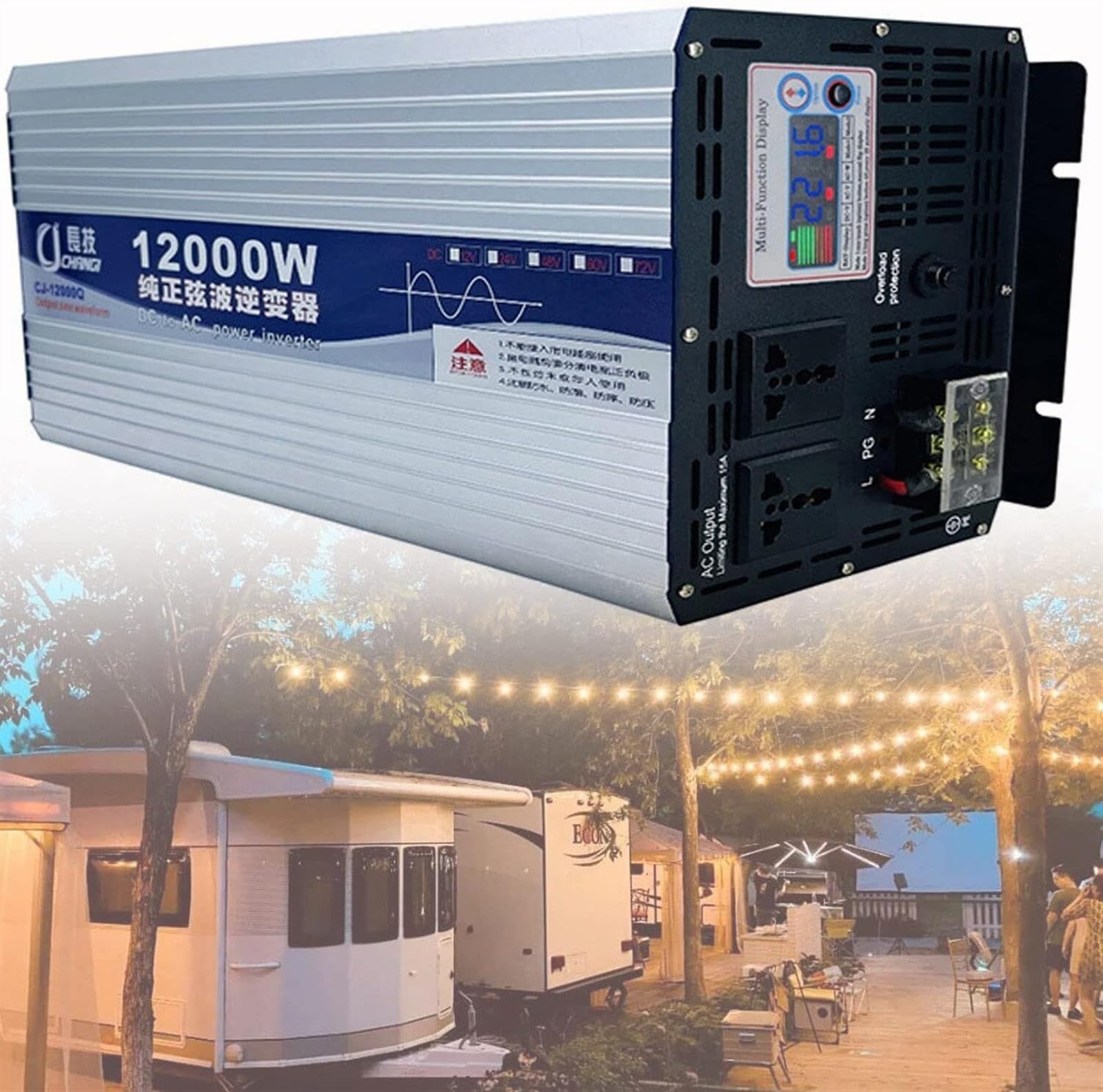 Du willst unterwegs nicht auf Strom verzichten? Dieser Wechselrichter macht's möglich! Er wandelt 72V Gleichstrom in 110V Wechselstrom um - mit satten 6000W Spitzenleistung und 3000W Dauerleistung. Perfekt für Camping, Roadtrips oder als mobile Stromversorgung.\n\nMit reinem Sinuswellen-Ausgang - das bedeutet, er arbeitet so sauber wie die Steckdose zu Hause. Deine empfindlichen Elektrogeräte wie Laptops, Handys oder Kameras werden es dir danken!\n\nWas kann er alles?\n- Laptops und Computer betreiben\n- Handys und Tablets laden\n- Kleine Kühlschränke versorgen\n- Fernseher und Entertainment-Geräte\n- Werkzeuge und Lampen\n\nMehrfach-Schutz inklusive: Überlastschutz, Überhitzungsschutz, Kurzschlussschutz und Verpolungsschutz. Das Aluminium-Gehäuse sorgt für gute Wärmeableitung. Wichtig: Vor dem Anschließen den Schalter ausschalten und die Kabel festziehen - lockerer Kontakt führt zu Überhitzung!
