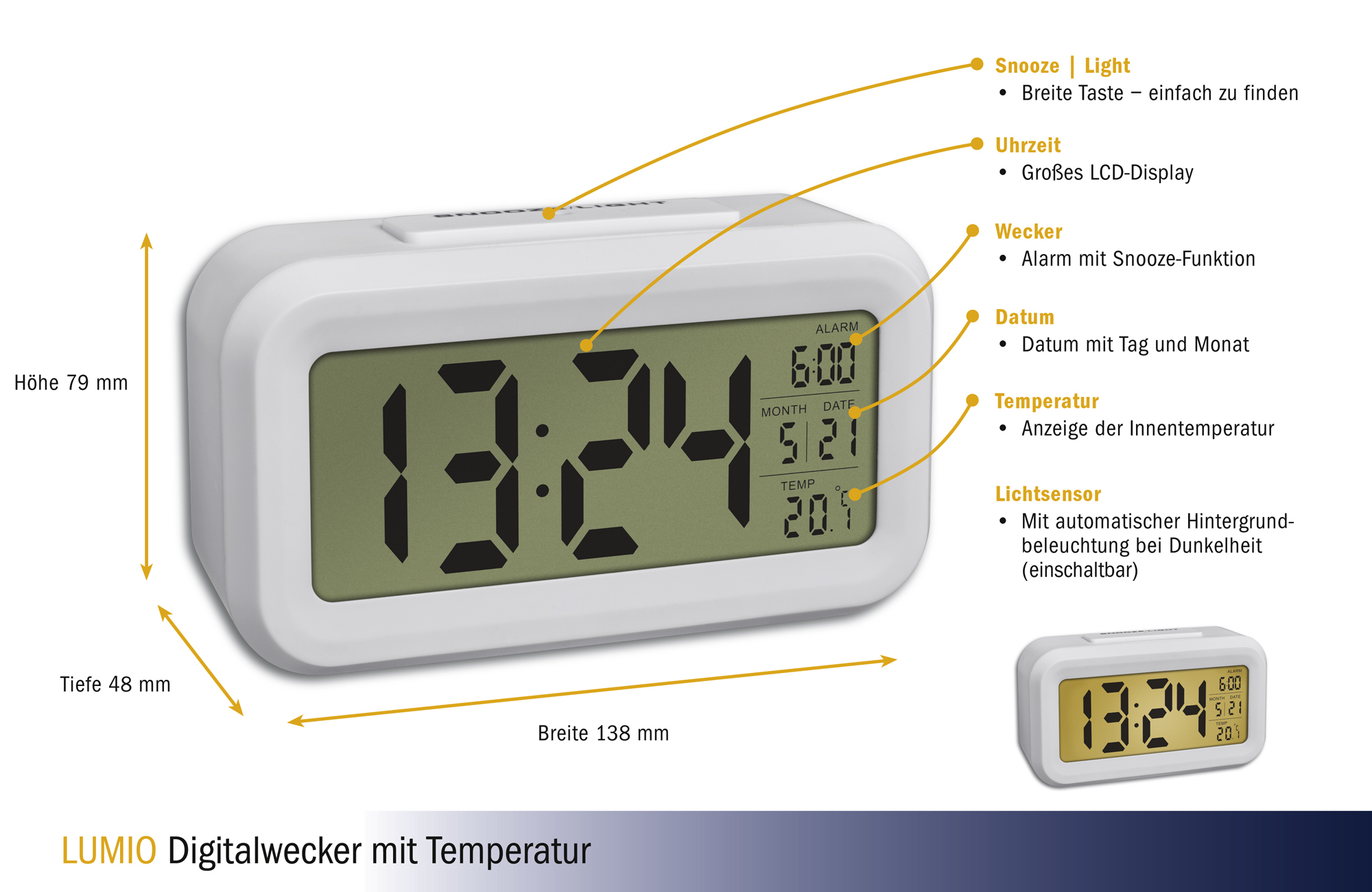 Alles in einem: Wecker, Thermometer und Hygrometer! Dieser praktische kleine Helfer zeigt dir Uhrzeit, Datum, Temperatur und Luftfeuchtigkeit auf einen Blick. Perfekt für Nachttisch oder Kühlschrank!