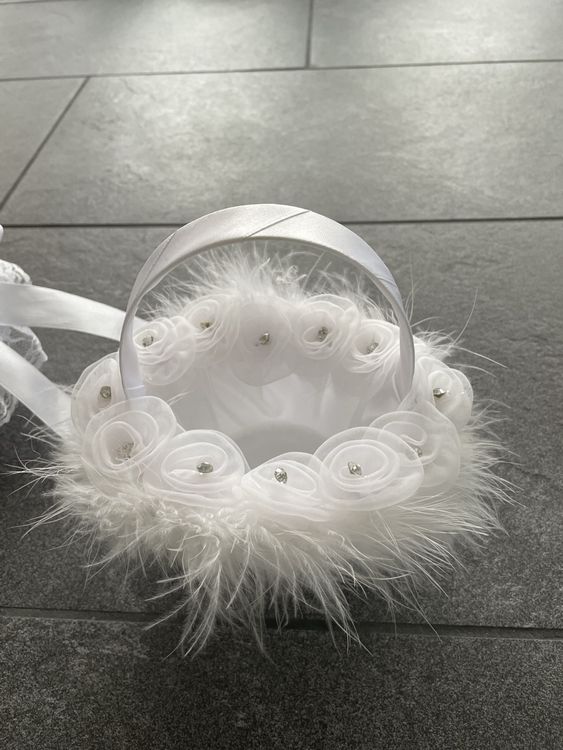 Zauberhaft für die Traumhochzeit! Dieser weiße Blumenmädchen-Korb mit zarter Spitze und Schleifen ist perfekt für den großen Tag. Ca. 22x15cm groß - ideal für kleine Hände. Kann mit Blütenblättern, Süßigkeiten oder Deko gefüllt werden. Wunderschöne Verarbeitung mit Perlen und Bändern - einfach romantisch! Auch als Tischdekoration oder für Ostern geeignet. Schafft unvergessliche Momente und tolle Fotos. Deine Blumenmädchen werden sich wie kleine Prinzessinnen fühlen - einfach magisch!
