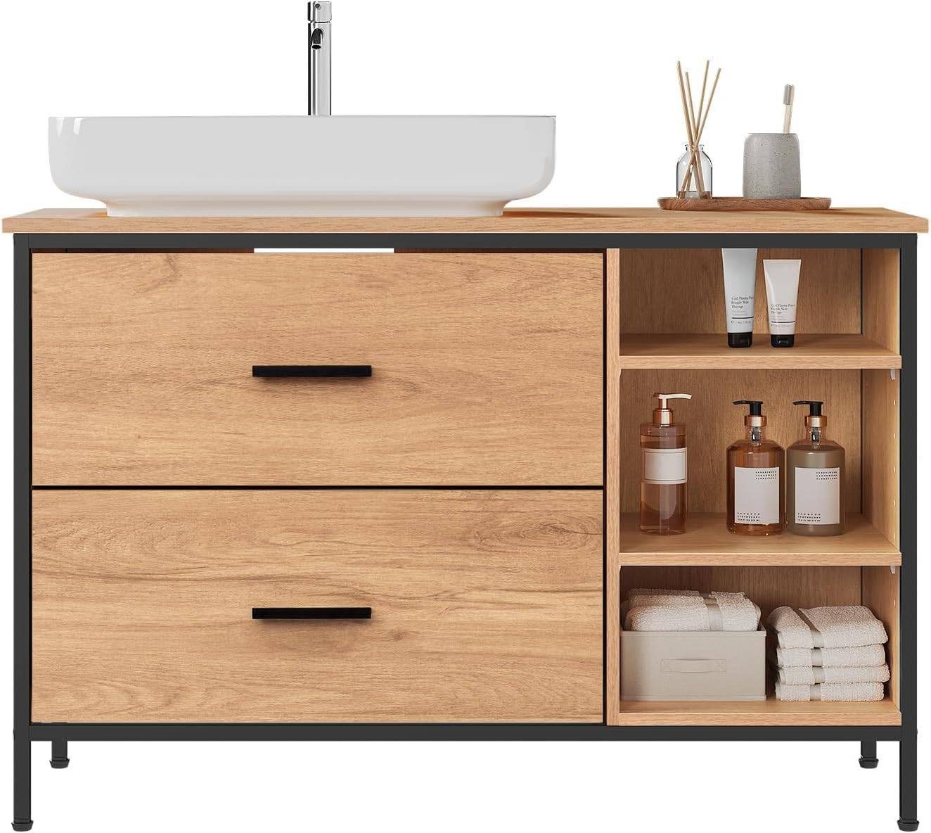Noch mehr Stauraum: Eine große Schublade unten, offene Fächer an den Seiten, und sogar abnehmbare Metallstangen für Handtücher. Alles da, was man im Bad so braucht!