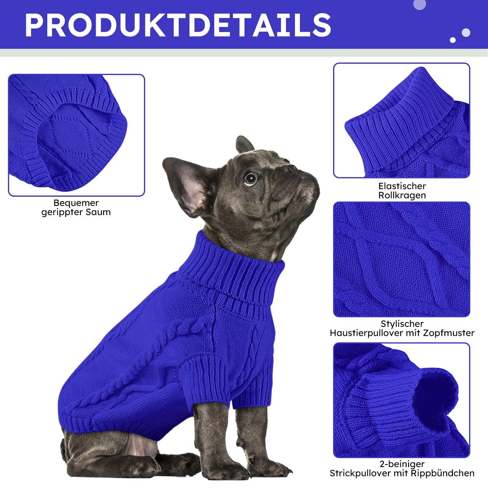 Oh wie süß! Dieser Hundepullover mit Rollkappen hält deinen Liebling im Winter richtig kuschelig warm. Aus weichem Acrylgarn - dehnbar und hautfreundlich. Der hohe Kragen schützt den Nacken, die Bauchbinde wärmt Brust und Bauch. Besonders praktisch: Der höhere Bauchschnitt erleichtert Toilettenpausen - kein lästiges Aus- und Anziehen! Das klassische Zopfmuster-Design passt zu Rüden und Hündinnen gleichermaßen. Perfekt für Weihnachten, Spaziergänge im Winter oder einfach nur zum Kuscheln auf dem Sofa. Es gibt 6 Größen von XS bis XXL - für Chihuahuas, Französische Bulldoggen, Labradore und viele mehr. Einfach Brustumfang und Rückenlänge deines Hundes messen und die passende Größe wählen. Ob für festliche Anlässe oder den täglichen Einsatz - dieser Pulli ist ein Must-have in jeder Hundegarderobe. Dein Hund wird's dir danken!