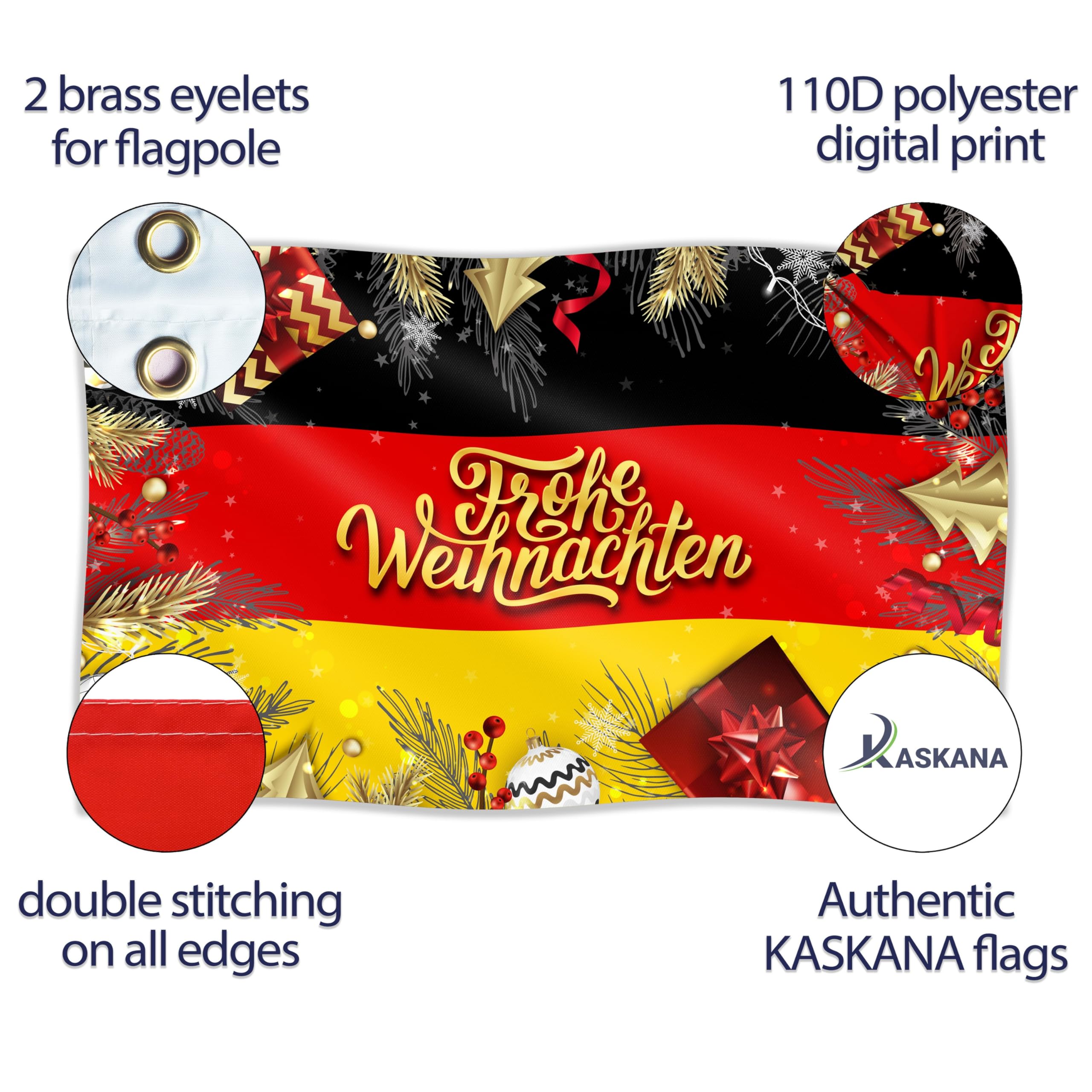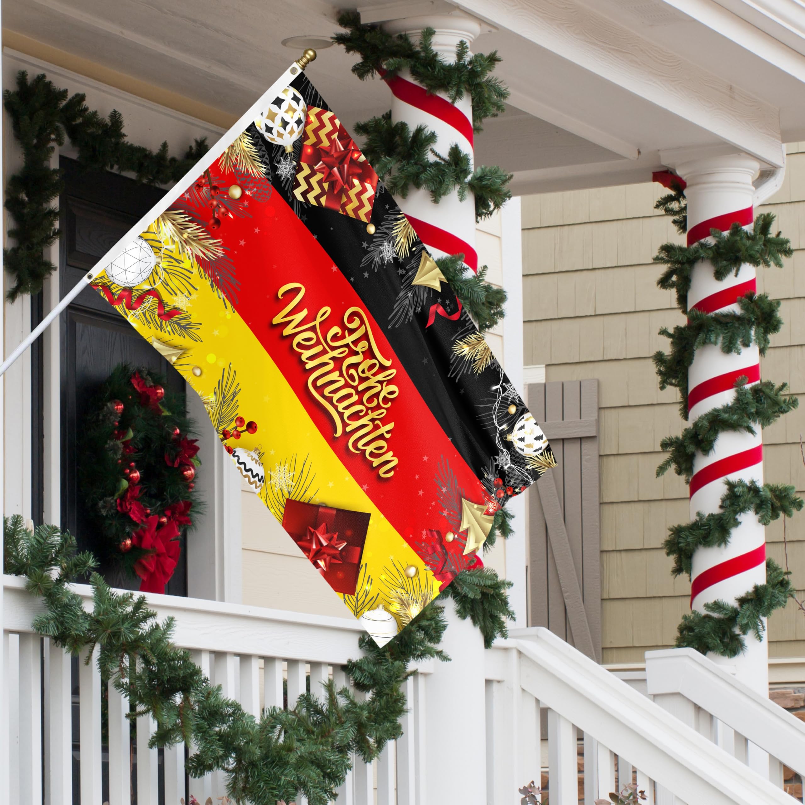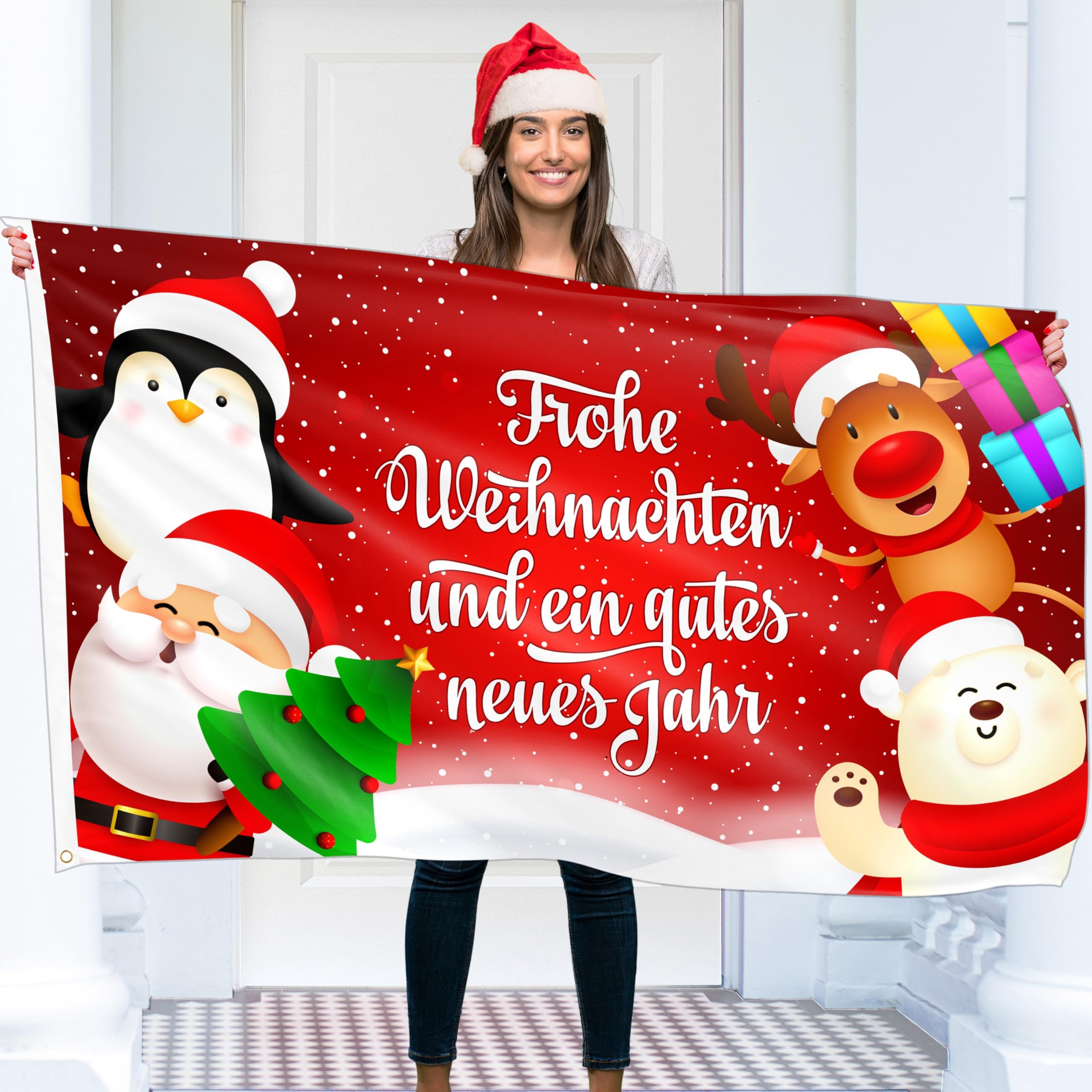 Mach dein Zuhause weihnachtlich mit dieser schönen Weihnachtsfahne! Mit der Aufschrift 'Frohe Adventszeit' bringt sie sofort Festtagsstimmung. Die Maße von 90x150 cm sind ideal für Haus, Garten oder Balkon. Mit zwei Messingösen kannst du sie einfach an einem Fahnenmast befestigen. Der lebendige Digitaldruck in kräftigen Farben ist UV-beständig - die Farben verblassen also nicht in der Sonne. Hergestellt aus starkem 110-Den-Polyester, der rundherum doppelt genäht ist für extra Langlebigkeit. Perfekt für den Innenbereich und für den Außenbereich bei mildem Wind. Bei starkem Wind empfehlen wir allerdings, sie lieber drinnen zu verwenden. Tolle Dekoration für die Vorweihnachtszeit, Silvester oder Winterpartys. Auch als Foto-Hintergrund für unvergessliche Weihnachtsfotos super geeignet. Eine Fahne reicht meist schon, um einen ganzen Raum festlich zu schmücken. Hol dir die Weihnachtsstimmung ins Haus - diese Fahne ist ein echter Hingucker!