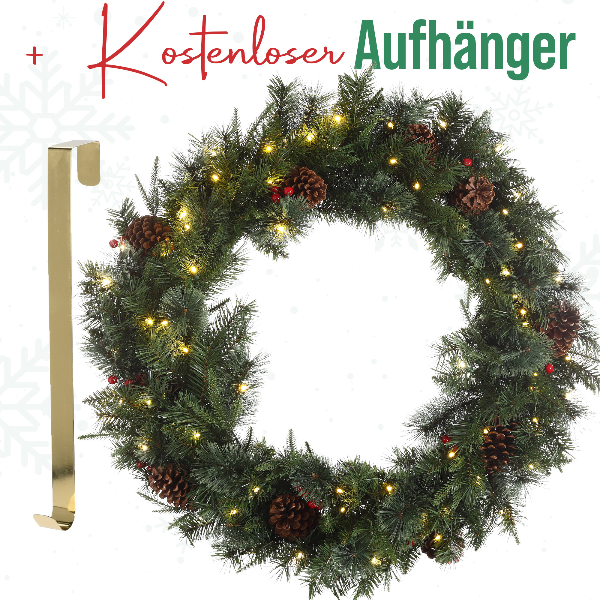 Weihnachtsstimmung garantiert! Dieser wunderschöne künstliche Weihnachtskranz mit 45 cm Durchmesser bringt festlichen Charme in dein Zuhause. Die täuschend echte Optik mit Tanne, Eukalyptus, Tannenzapfen und roten Beeren wirkt wie frisch aus dem Wald geholt. Aus hochwertigem Kunststoff auf stabiler Rebenbasis - nadelt nicht und behält seine ganze Pracht über viele Jahre. Perfekt für Innenräume und geschützte Außenbereiche. Vielseitig einsetzbar: als Türkranz, Wanddekoration oder mit Kerze in der Mitte als Tischschmuck. Einfach aufhängen und sofort weihnachtliche Atmosphäre genießen - ohne Pflegeaufwand! Auch in 60 cm erhältlich.