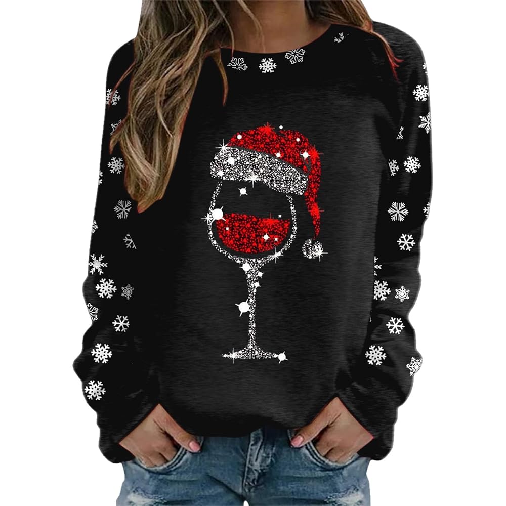 Weihnachtspullover Damen Mit Weinglas Design - Roter Christmas Sweater Rundhals