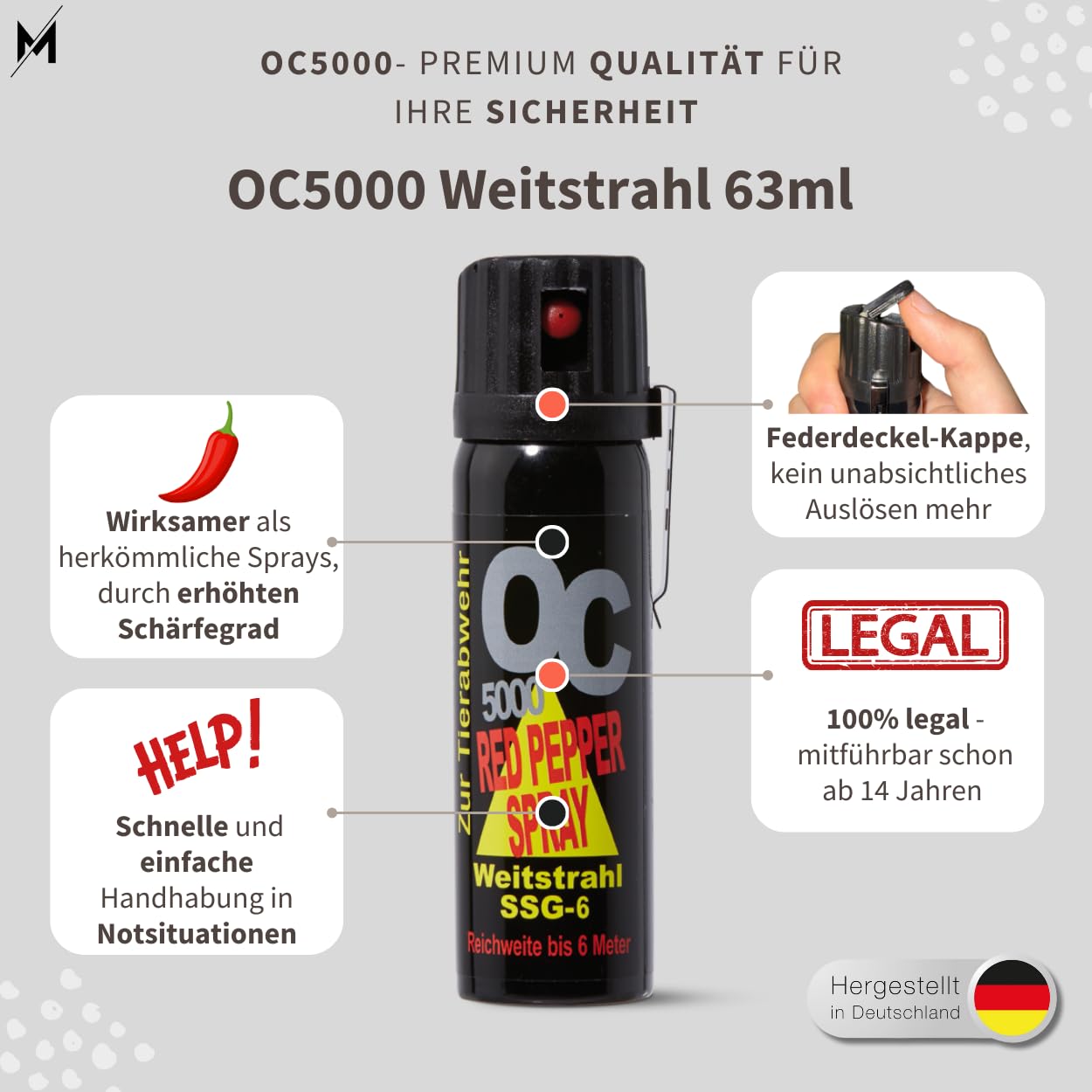 Sicherheit to go! Dieses Pfefferspray aus deutscher Produktion mit Weitstrahl-Funktion ist weniger windanfällig und zielgenauer. Mit 40ml Inhalt und 3-5 Meter Reichweite. Enthält natürliches Oleoresin Capsicum aus Pfefferschoten. Mit praktischem Gürtelclip für unterwegs. Achtung: In Deutschland nur zur Tierabwehr zugelassen, in Notwehr auch gegen Menschen erlaubt! Ab 14 Jahren frei verkäuflich. Aus hochwertigem Material - kein Billigprodukt. Für mehr Sicherheit beim Joggen, Wandern oder nächtlichen Heimweg!