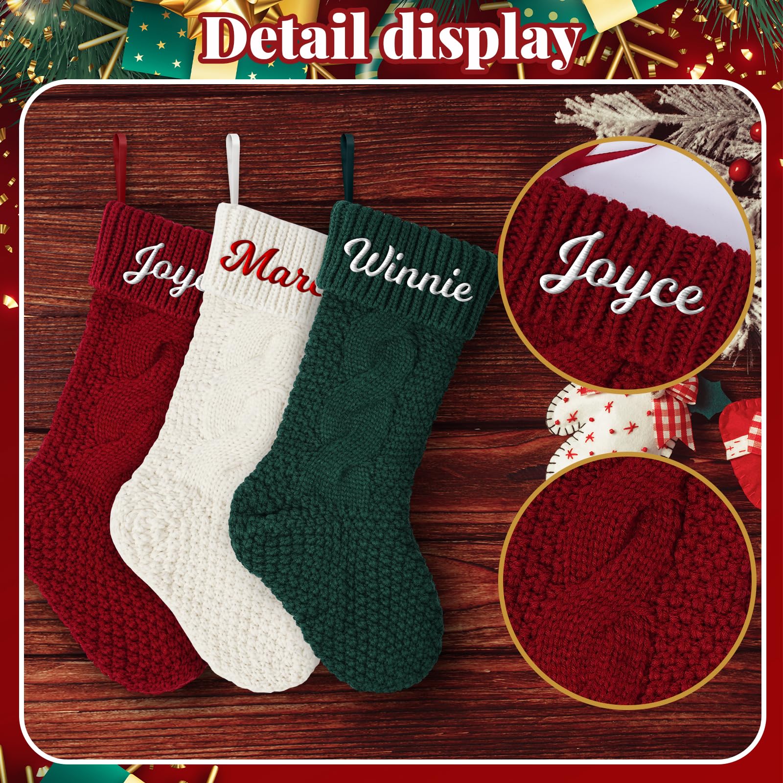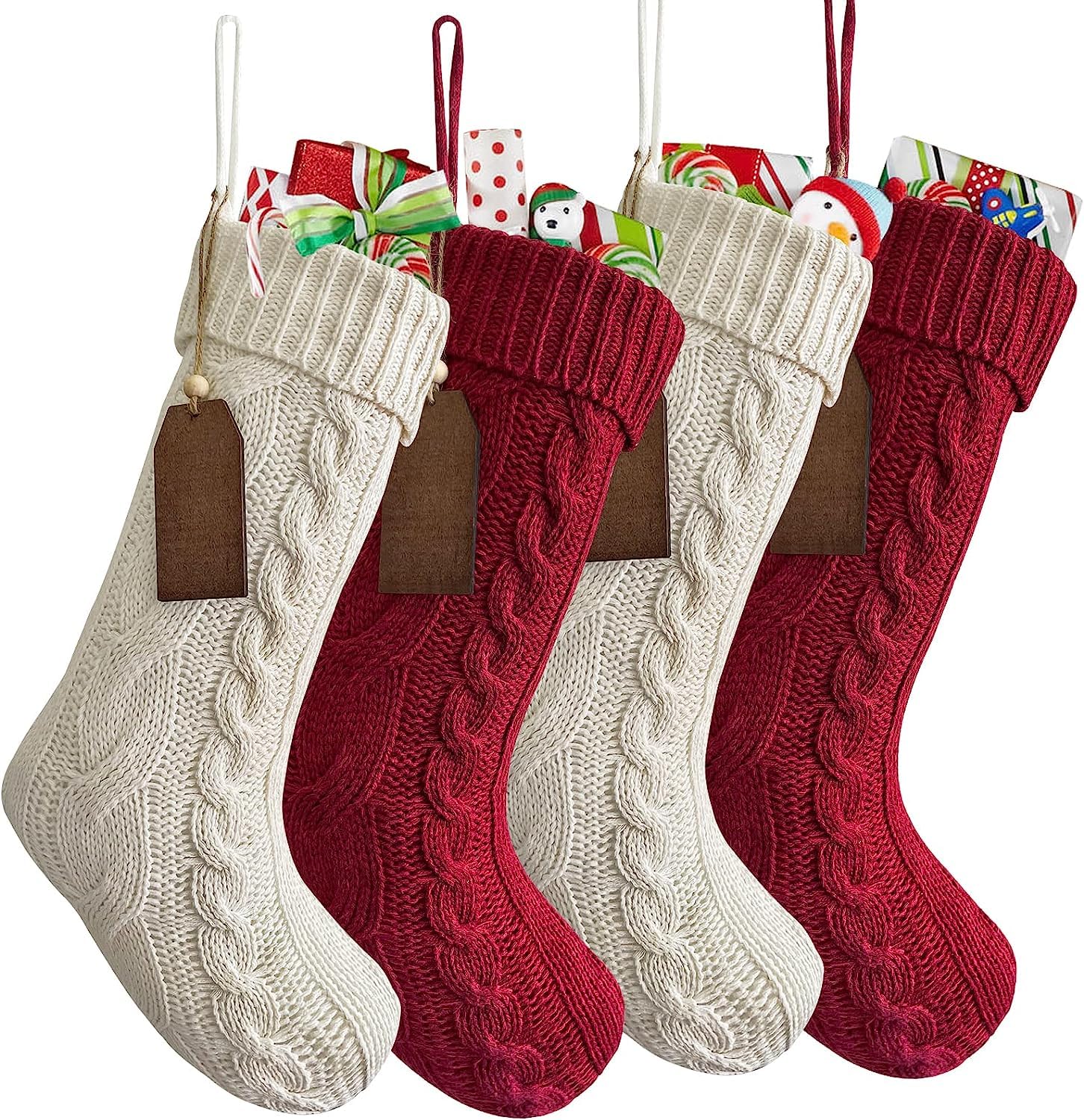 Juhu, diese 4 Weihnachtsstrümpfe von Weldomcor machen dein Zuhause richtig weihnachtlich! Mit 46cm Länge und 15cm Breite sind sie groß genug für viele kleine Geschenke - ob Süßigkeiten, Pralinen, Uhren oder Spielzeugautos! Aus dickem, schwerem Strickgarn gefertigt, fühlen sie sich super weich an und sind mega langlebig. Das coole Zopfmuster-Design sieht total rustikal aus und verbreitet sofort gemütliche Weihnachtsstimmung! Das Set kommt mit 4 Strümpfen, 4 Kartenhaltern und 12 Namensschildern - du kannst sie also für die ganze Familie personalisieren! Einfach die Namen draufschreiben und schon hat jeder seinen eigenen persönlichen Strumpf! Perfekt zum Aufhängen am Kamin, Weihnachtsbaum, Wand, Tür oder Treppengeländer! Die stabile Aufhängeöse hält super sicher - auch wenn die Strümpfe voll mit Geschenken sind! In Khaki und Weiß passen sie zu jeder Weihnachtsdekoration! Ob für dein Zuhause, Büro oder als Geschenk - diese Strümpfe bringen jedem Freude! Mach deine Weihnachten unvergesslich und bestell dir dieses super süße Set!