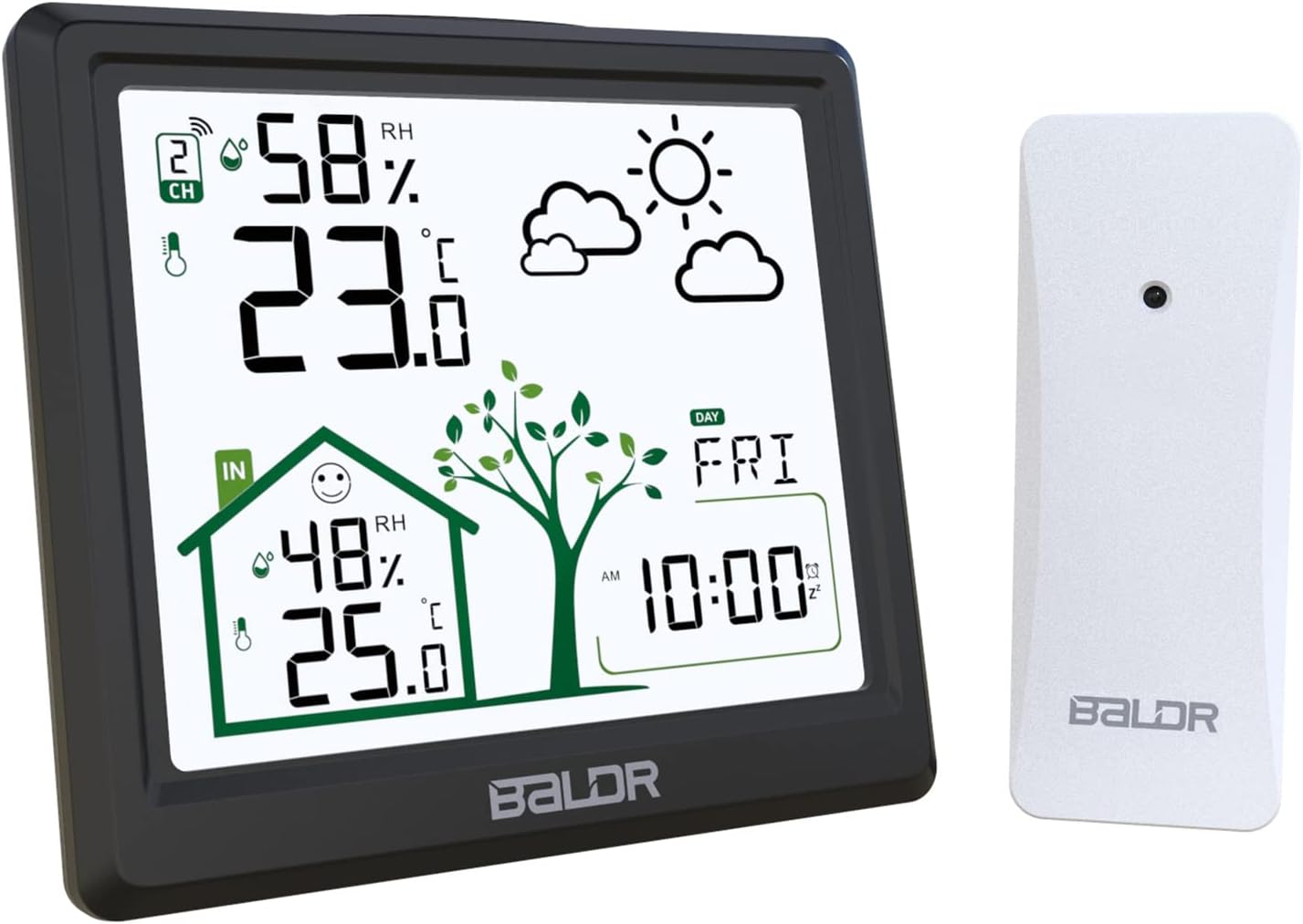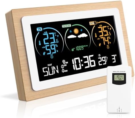 Hey, mit dieser Wetterstation hast du dein persönliches Wetterstudio zu Hause! Das farbige Display zeigt dir alles was du wissen willst: Temperatur innen und außen, Luftfeuchtigkeit, Luftdruck, und sogar eine 12-Stunden-Vorhersage.\\n\\nDer Außensensor ist kabellos und hat eine Reichweite von bis zu 60 Metern - du kannst ihn also easy im Garten, auf dem Balkon oder in der Garage platzieren. Mit IPX4 ist er spritzwassergeschützt, also macht ihm Regen nichts aus.\\n\\nCoole Features:\\n• Mondphasen und Gezeiten-Anzeige\\n• Komfort-Indikator fürs Raumklima\\n• Zwei Wecker mit Schlummerfunktion\\n• Automatischer Nachtmodus\\n• Dual-Stromversorgung (USB + Batterien)\\n\\nDie Station misst von -40°C bis 70°C draußen und -9,9°C bis 50°C drinnen - also für jeden Einsatzbereich geeignet.\\n\\nPerfekt für alle die genau wissen wollen was das Wetter macht, ob für den Garten, die Wäsche oder die nächste Radtour. Einfach aufstellen und immer bestens informiert sein!