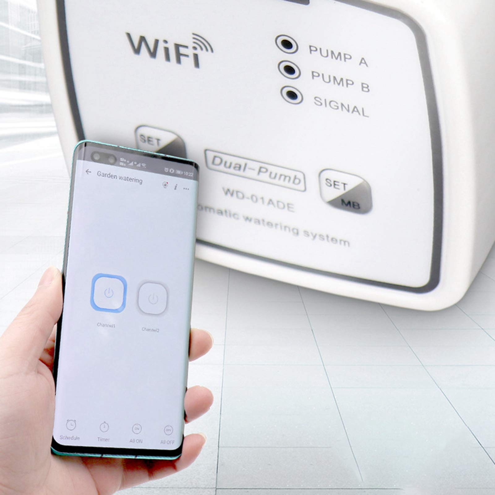 Mach deine Gartenbewässerung smart! Dieser WiFi Bewässerungs Timer mit Doppelpumpe steuerst du bequem per App. Einfach die 'eWebLink' App runterladen und mit dem 2,4GHz WLAN verbinden. Pumpe A und B arbeiten unabhängig - bewässere verschiedene Pflanzenarten getrennt! Du kannst Bewässerungsintervalle, Anzahl und Wassermenge genau einstellen. Mit Abschaltspeicherfunktion - nach Stromausfall keine Neueinstellung nötig. Im Lieferumfang: Timer, Netzteil, USB-Kabel, 15m Schlauch, 15 Tropfer, T-Stücke, Filter und Schraubendreher. Perfekt für Urlaube oder vergessliche Gärtner! Einfach einrichten und deine Pflanzen werden immer perfekt versorgt - egal wo du bist!