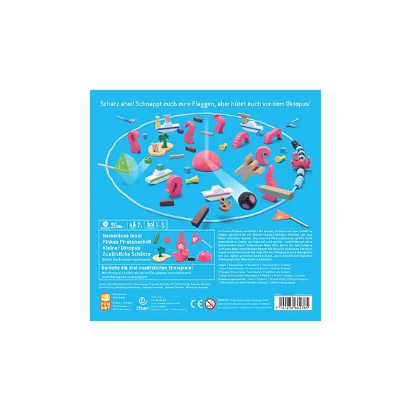 Achtung, wilder Oktopus im Anmarsch! Bei Crash Octopus geht es rund - im wahrsten Sinne des Wortes! Dieses super lustige Geschicklichkeitsspiel für 2-4 Spieler ab 7 Jahren bringt Action und Spaß in deine Spielerunde. Die Mission: Rette deine Schätze vor dem riesigen Kraken, der mit seinen Tentakeln alles bedroht! Mit den Fahnenstangen schnippst du die Schätze zurück auf dein Schiff - aber Vorsicht, nicht zu stark, sonst fällt alles wieder über Bord! Das Besondere: Es gibt kein Spielbrett, alles spielt sich auf dem wilden Ozean ab! Du kannst auch gegnerische Schätze ins Meer befördern - aber pass auf, dass dir nicht dasselbe passiert! Wer zuerst fünf verschiedene Schätze gesammelt hat, gewinnt! Oder wer am Ende die meisten Schätze hat, wenn die Zeit abläuft! Perfekt für Spieleabende mit Familie und Freunden - hier wird gelacht und gezockt was das Zeug hält! Einfache Regeln, aber mit hohem Spaßfaktor! Ideal für Kindergeburtstage, Familienfeiern oder einfach nur für einen lustigen Abend zu Hause! Das Spiel ist auf Deutsch und kommt von funbot - bekannt für super Familienspiele! Mach dich bereit für chaotische Spielmomente und jede Menge Lachen! Wer wird der beste Seebär und meistert die Oktopus-Herausforderung?