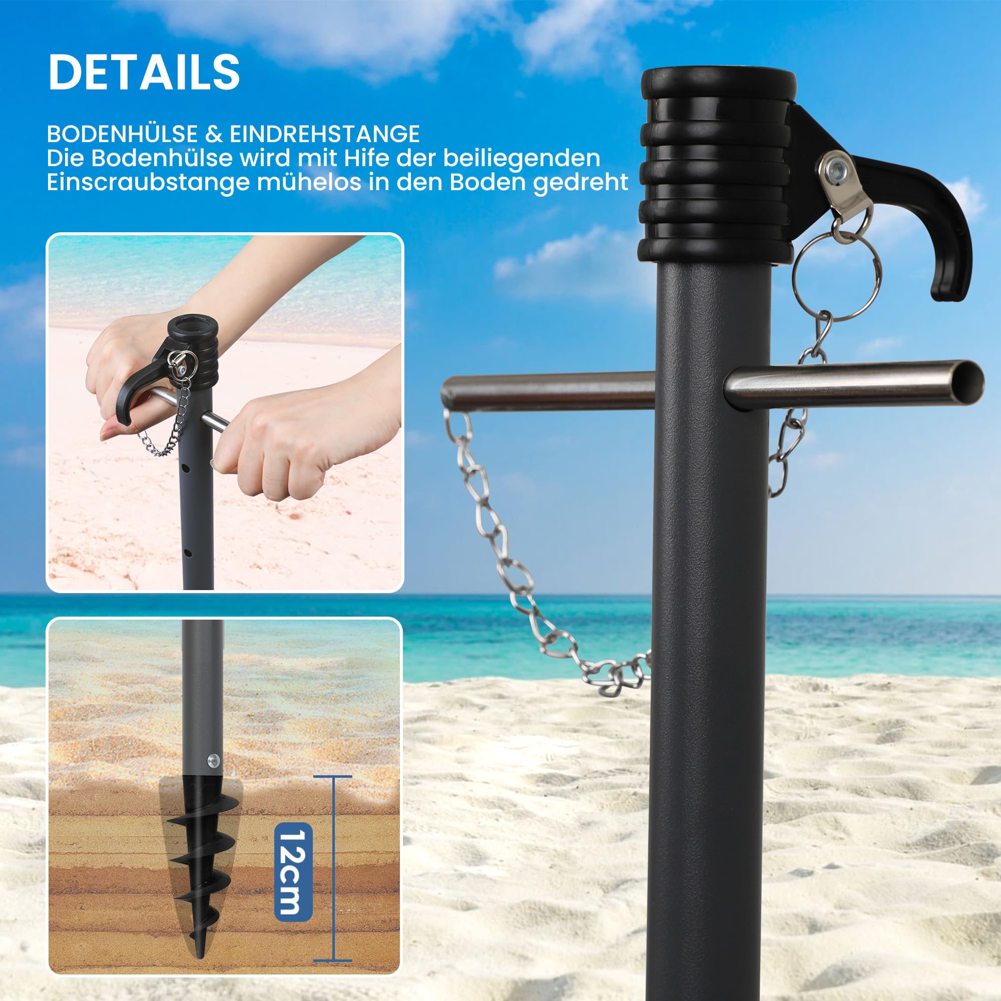 Genieße perfekten Sonnenschutz mit diesem robusten Strandschirm! 180cm Durchmesser bieten viel Schattenfläche. Aus 210D Oxford-Gewebe mit PU-Beschichtung - blockiert 98% der UV-Strahlen und ist wasserdicht. Besonders windstabil durch 8 Rippen und speziellen Luftauslass. Die 12cm Drehstange macht das Eindrehen im Sand zum Kinderspiel. Verstellbarer Neigungswinkel (30°) und Höhe - immer der Sonne nach. Inklusive praktischer Schutzhülle für Transport und Lagerung. Perfekt für Strand, Garten, Terrasse oder Balkon. Mit dunkel-hellblauen Streifen - ein echter Hingucker. Dein zuverlässiger Begleiter für sonnige Tage!
