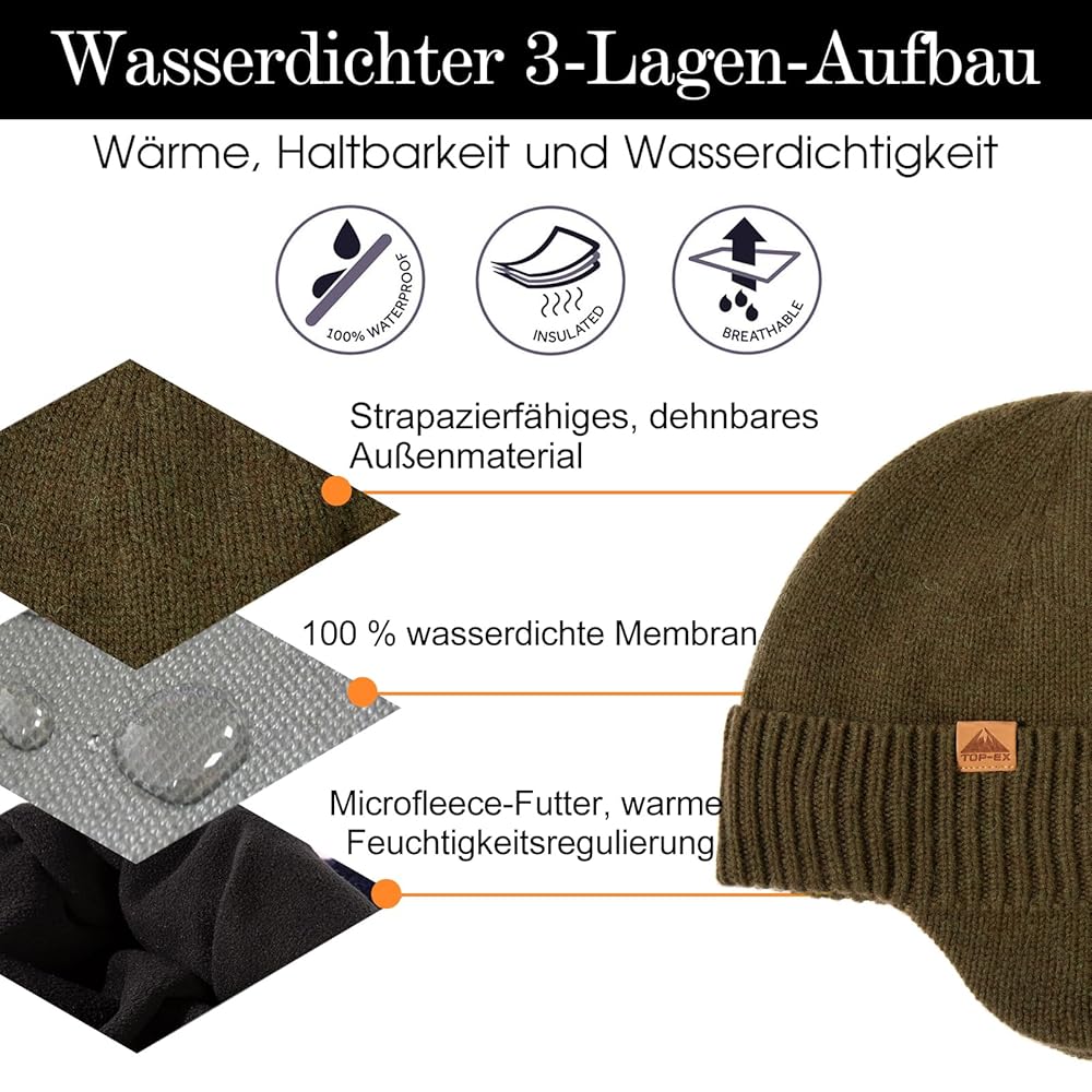 Bereit für den Winter! Diese TOP-EX Beanie mit integrierten Ohrenklappen hält dich auch bei eisigen Temperaturen warm und trocken. Das spezielle DryKnit-System besteht aus drei Lagen: gerippte Strickaußenschicht, wasserdichte Membran und kuscheliges Fleecefutter.