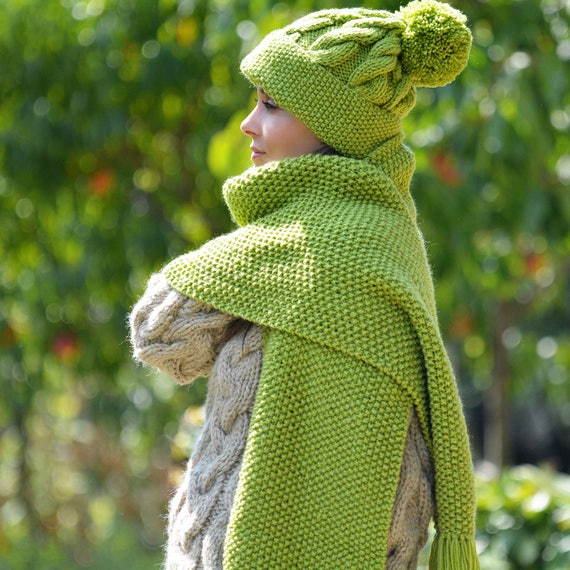 Winterschal Aus Yakwolle - Handgewebt Oversized Schal Mit Blätterdruck (Grün)