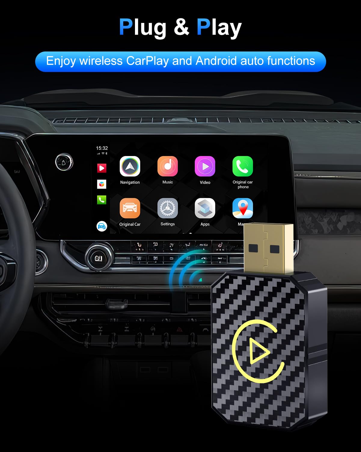 Endlich kabellos im Auto! Dieser geniale Adapter verwandelt dein kabelgebundenes CarPlay oder Android Auto in eine wireless Lösung! Einfach den USB-Dongle einstecken und sofort genießt du die Freiheit ohne lästige Kabel. Mit dem modernen V851-Chip für maximale Geschwindigkeit und Stabilität. Das edle Design mit Metallgehäuse und Glasfront sieht nicht nur gut aus, sondern sorgt auch für beste Wärmeableitung. Perfekt für Fahrzeuge ab Baujahr 2017 mit originalem CarPlay oder Android Auto System. Nach der ersten Einrichtung verbindet sich alles automatisch beim Start - super bequem! Voll kompatibel mit Navigation, Musik-Streaming, Sprachassistenten und Telefonie. Wichtig: Dein Auto muss werkseitig kabelgebundenes CarPlay ODER Android Auto unterstützen und einen Touchscreen haben. iPhone Nutzer benötigen iOS 10 oder neuer, Android User mindestens Version 11. Keine Cross-Kompatibilität zwischen den Systemen. Plug & Play - keine App Installation nötig! Hol dir dieses Upgrade und genieße ein modernes, kabelloses Fahrerlebnis ohne Aufwand. Sag goodbye zu Kabelsalat im Auto!