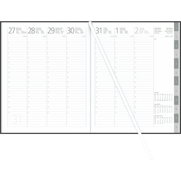 Organisationsfreaks, dieses Zettler Wochenbuch für 2026 ist euer neuer bester Freund! In edlem Anthrazit mit wattiertem Kunststoffeinband sieht es nicht nur professionell aus, sondern ist auch super praktisch. Mit 21x26cm Format bietet es auf 128 Seiten jede Menge Platz für alle Termine. Das Besondere: Jede Woche wird auf zwei Seiten dargestellt - so behältst du immer den Überblick! Von 7 bis 22 Uhr ist der Tag durchgetaktet, Sonn- und Feiertage sind hervorgehoben. Mit der Eckperforation findest du blitzschnell den aktuellen Tag, und das Lesezeichen hilft zusätzlich. Das fadengesiegelte Chamois-Papier fühlt sich edel an und ist extrem stabil. Aber das ist noch nicht alles: Das Kalendarium ist 5-sprachig (Deutsch, Englisch, Französisch, Spanisch, Italienisch) - perfekt für internationale Termine! Dazu gibt's Arbeitstagezählung, Wochenzählung, Telefon- und Adressverzeichnis sowie Extraseiten für Notizen. Die Dreimonatsübersicht hilft bei der langfristigen Planung. Ob fürs Büro, Studium oder privat - mit diesem Kalender vergisst du garantiert nichts mehr. Ein hochwertiger Begleiter durchs ganze Jahr, der sich gut anfühlt und noch besser funktioniert. Typ 728 - für alle, die Wert auf Qualität und Übersichtlichkeit legen!
