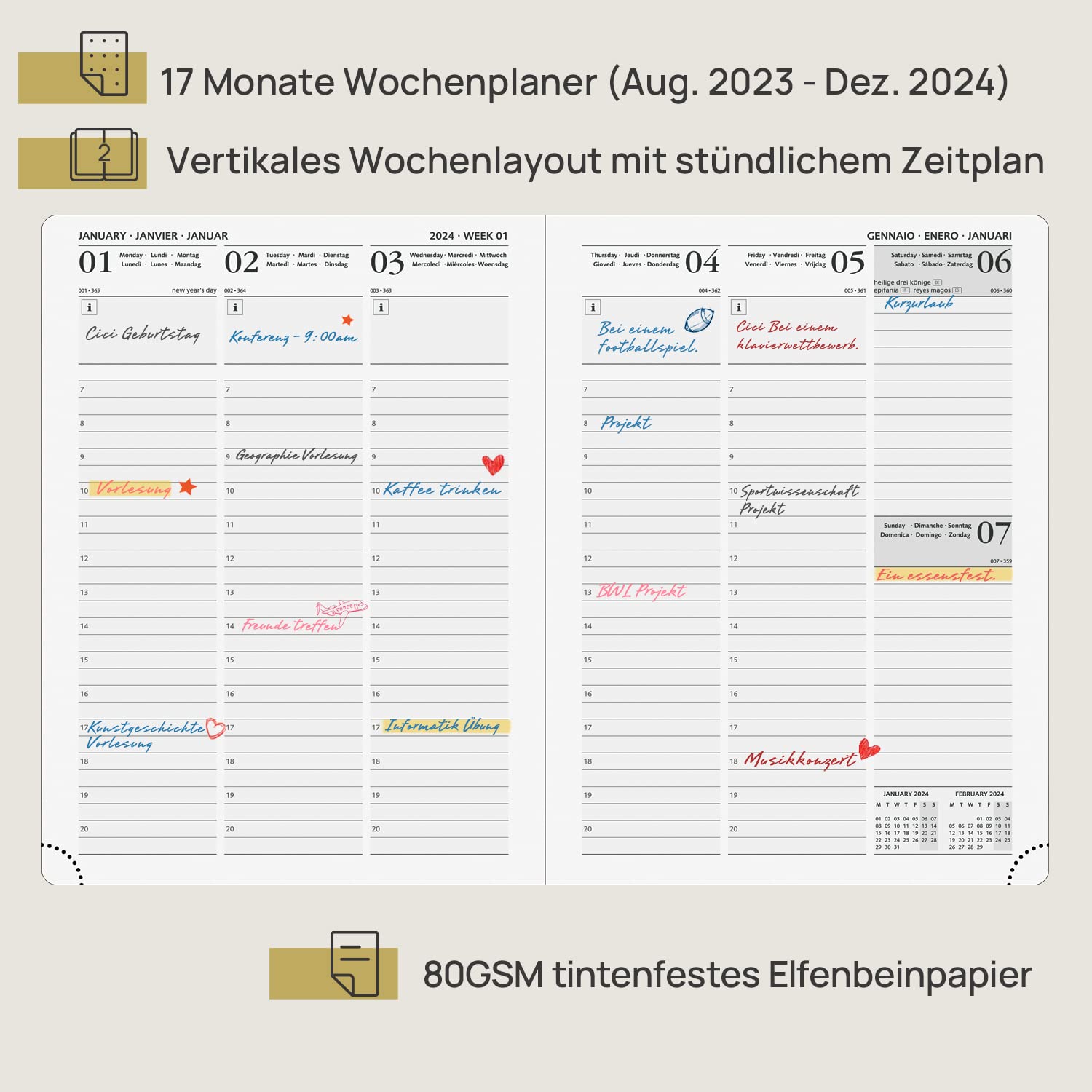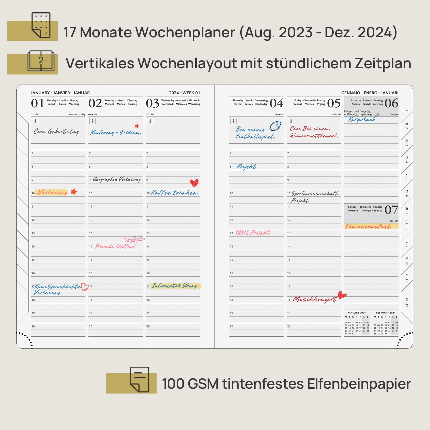 Organisation kann so schön sein! Dieser elegante Wochenplaner begleitet dich von August 2023 bis Dezember 2024 - ganze 17 Monate voller Termine, Ideen und Pläne.