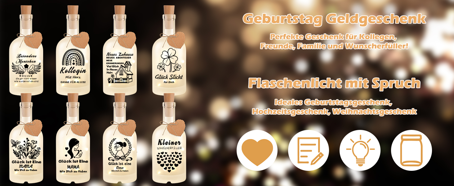 Wow, was für eine coole Geschenkidee! Dieser Wunscherfüller ist nicht nur irgendeine Geldgeschenk-Verpackung - das ist ein richtiges Erlebnis. Du kriegst eine hübsche Flasche mit dem Spruch 'KLEINER Wunsch ERFÜLLER' und nem Sternenmuster drauf. Mit nem LED-Licht innen (Batterien musst du separat besorgen) wird die Flasche zum echten Hingucker. Im Set ist alles dabei was du brauchst: Die Flasche selbst, LED-Licht, ne süße 'Alles Gute'-Karte, Samtbeutel, Herzetikett, 10 gelbe Kabelbinder und ne Kordel. So kannst du Geldscheine oder persönliche Nachrichten richtig kreativ an der Flasche befestigen. Perfekt für Geburtstage, Weihnachten, Schulabschlüsse, Hochzeiten oder einfach mal als Dankeschön. Die Flasche kommt in nem edlen Samtbeutel - musst du nicht mal extra einpacken. Einfach Geldscheine mit den Kabelbindern festmachen, LED-Licht rein, und schon hast du ein Geschenk das garantiert für strahlende Augen sorgt. Viel mehr als nur Geld überreichen - damit machst du jedem eine riesige Freude!