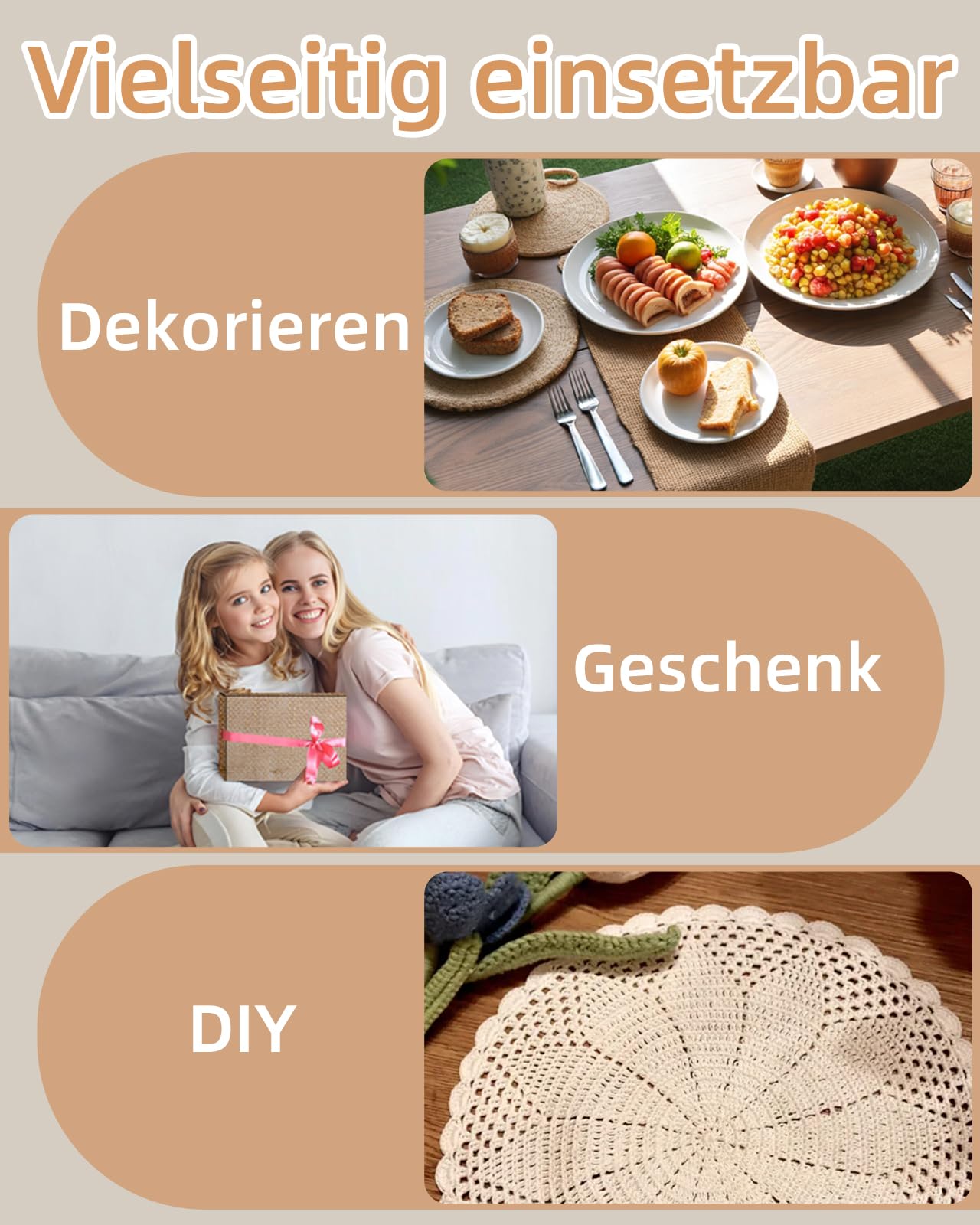 Echt natürlicher Jute-Läufer in praktischer Rolle! Mit 30 cm Breite und ganzen 10 Metern Länge hast du genug Material für alle deine Dekorations-Ideen. Das Beste: Die Rolle lässt sich ganz einfach zuschneiden, ohne dass die Kanten ausfransen. Dazu gibt's noch 20 Meter Jute-Schnur gratis - perfekt zum Binden von Blumensträußen oder Geschenken. Der Jute-Stoff ist 100% naturrein, ohne chemische Zusätze und komplett biologisch abbaubar. Super für alle, die umweltbewusst dekorieren wollen! Ob für Hochzeiten, Taufen, Kommunionen oder Gartenpartys - der rustikale Look passt immer und verleiht jedem Event eine gemütliche Atmosphäre. Der Läufer ist richtig robust und langlebig, kannst du also immer wieder verwenden. Zusammen mit Kerzen, Blumen oder anderen Vintage-Elementen kommt der natürliche Charme voll zur Geltung. Die Jute-Schnur ist vielseitig einsetzbar - nicht nur für Tischdekoration, sondern auch für alle möglichen DIY-Projekte im Landhausstil. Einfach den Läufer auf die gewünschte Länge schneiden, eventuell mit der Schnur verzieren und schon hast du eine wunderschöne Tischdekoration die sich sehen lassen kann! Egal ob für festliche Anlässe oder einfach nur um deinem Zuhause mehr Gemütlichkeit zu verleihen - mit diesem Jute-Läufer machst du nichts falsch!