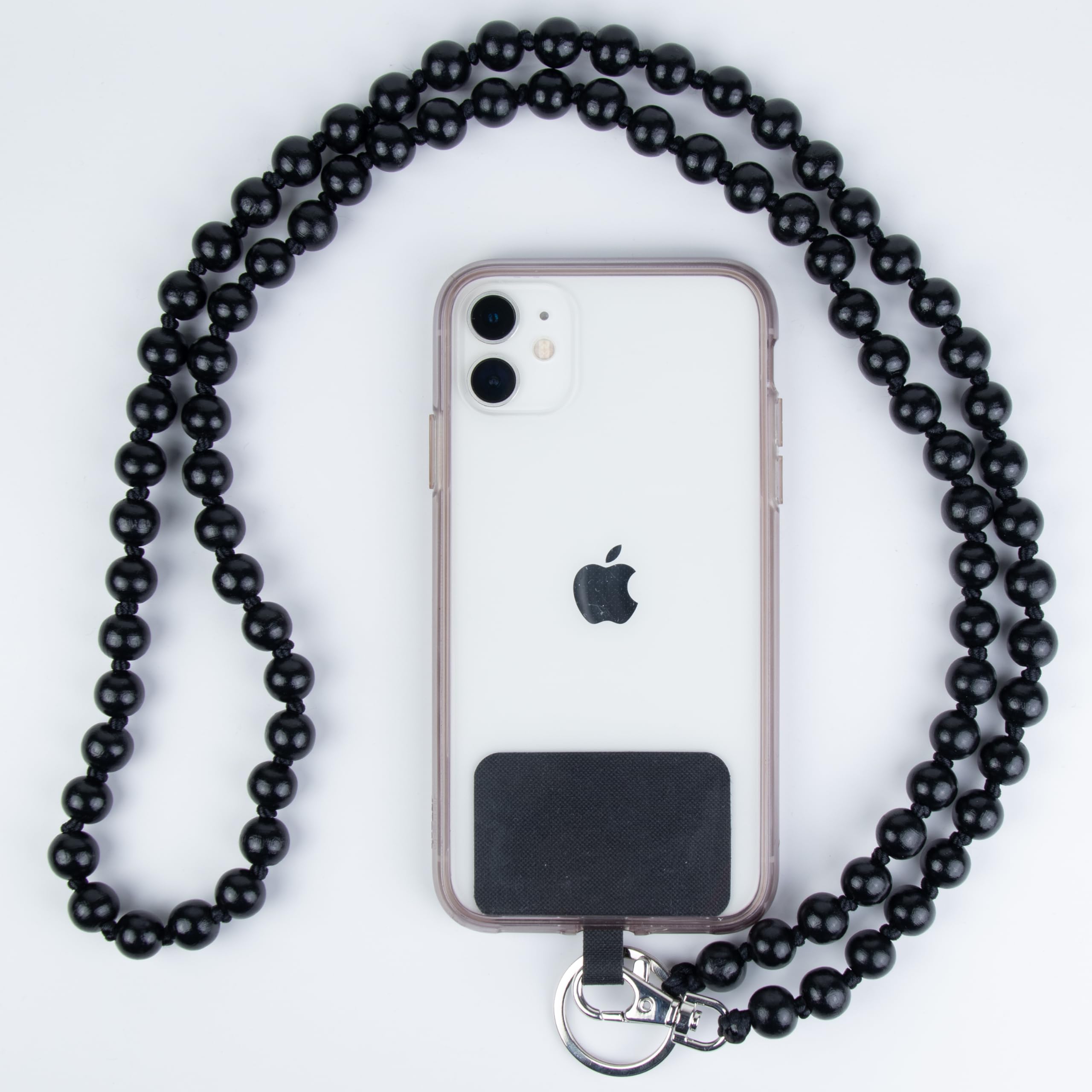 Nie wieder das Handy verlegen oder fallen lassen! Diese stylische Handykette aus schwarzen Perlen mit weißen Akzenten ist nicht nur praktisch, sondern sieht auch noch mega aus. Mit 120cm Länge passt sie perfekt um den Hals oder über die Schulter.