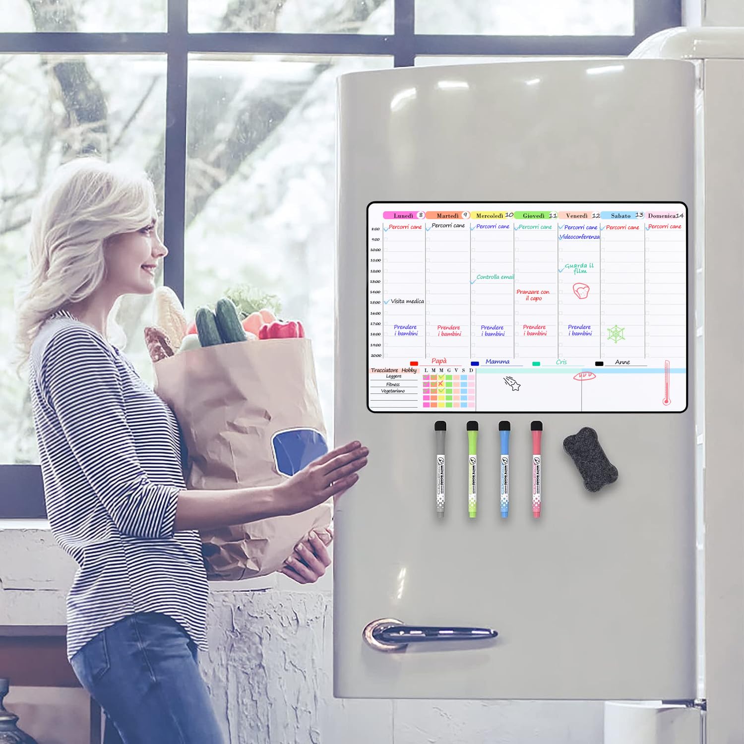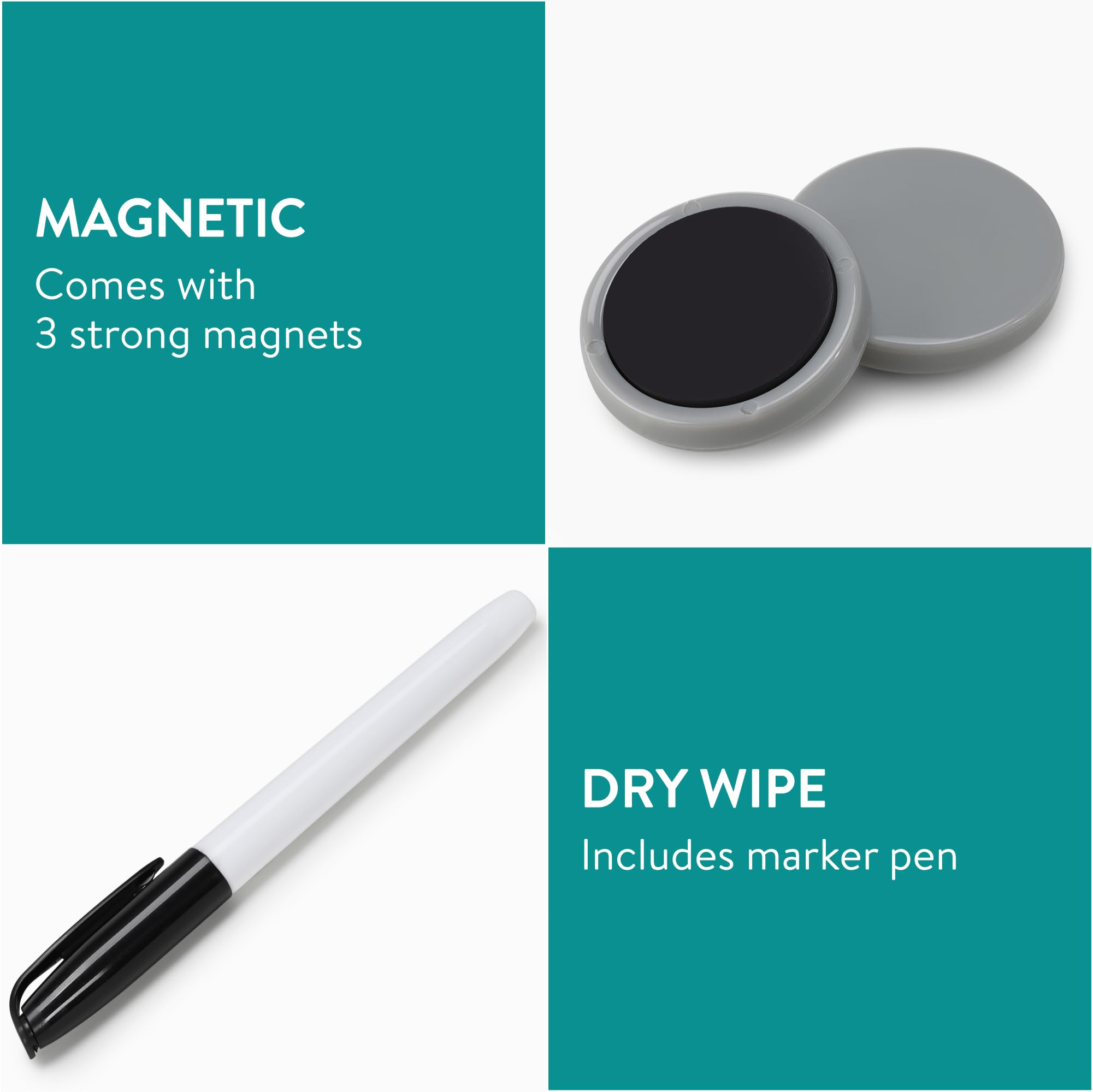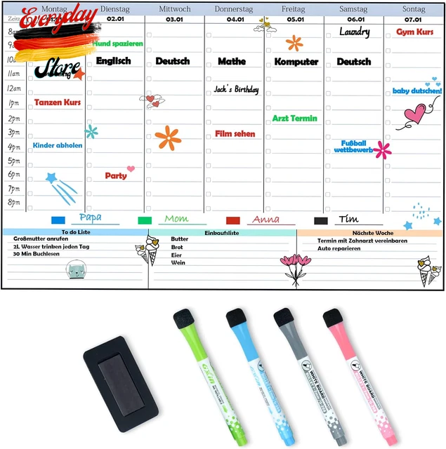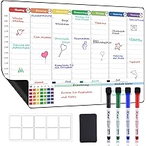 Richtig praktisch dieses Whiteboard-Set für den Kühlschrank! Mit 40x30cm Größe hast du genug Platz für deine Wochenplanung, To-Do-Listen oder den Familien-Speiseplan. Die starken Magnete halten bombenfest am Kühlschrank - kein lästiges Runterfallen! Im Set sind gleich 6 bunte Whiteboard-Marker und ein Radiergummi dabei. Das besondere PE-Folienmaterial lässt sich super leicht beschriften und genauso einfach wieder abwischen. Ohne lästige Rückstände! Einfach die Schutzfolie abziehen und auf den Kühlschrank kleben - keine Werkzeuge, kein Bohren, kein Kleben nötig. Perfekt für die ganze Familie: Ob Termine, Einkaufslisten oder tägliche Aufgaben - alles hat jetzt seinen Platz. Macht nicht nur das Leben organisiert, sondern sieht auch noch stylisch aus. Endlich Ordnung in der Küche!