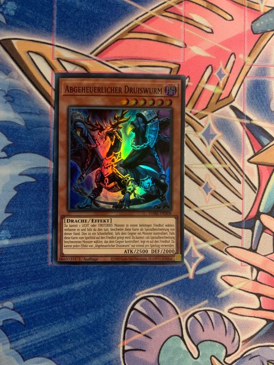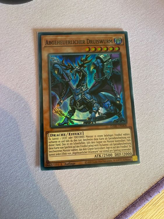 Alter, diese Secret Rare Karte ist ja mal richtig was Besonderes! Der Abgeheuerliche Druiswurm aus dem 25th Anniversary Tin: Dueling Heroes Mega Pack - in 1. Auflage und auf Deutsch! Ein absolutes Must-Have für Sammler und Turnierspieler. \\n\\nDer Effekt ist richtig stark: Du kannst LICHT oder FINSTERNIS Monster aus beliebigen Friedhöfen verbannen und diese Karte dann als Spezialbeschwörung bringen - und das als Schnelleffekt! Wenn sie dann doch mal auf den Friedhof kommt, kannst du noch ein Spezialbeschworenes Monster deines Gegners dorthin schicken. \\n\\nUnd das Beste: Inklusive exklusivem RC-Fieldcenter für perfekte Spielfeldorganisation bei Turnieren. Die Karte kommt near mint oder besser an und ist sicher verpackt gegen Knicke und Transportschäden. \\n\\nOb für dein Deck oder die Sammlung - diese Karte macht einfach was her! Einfach zuschlagen, bevor sie weg ist.