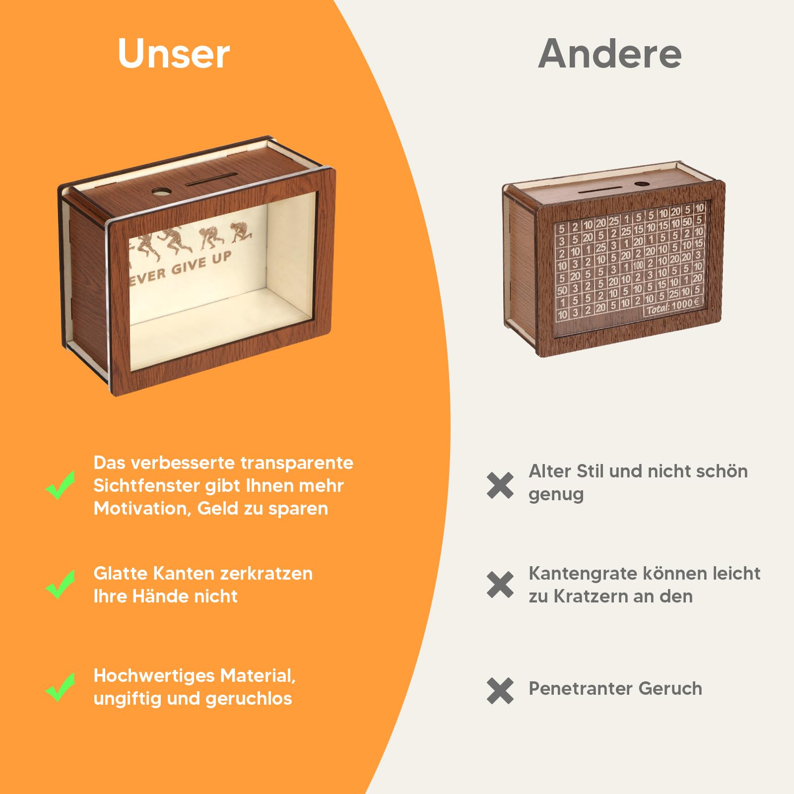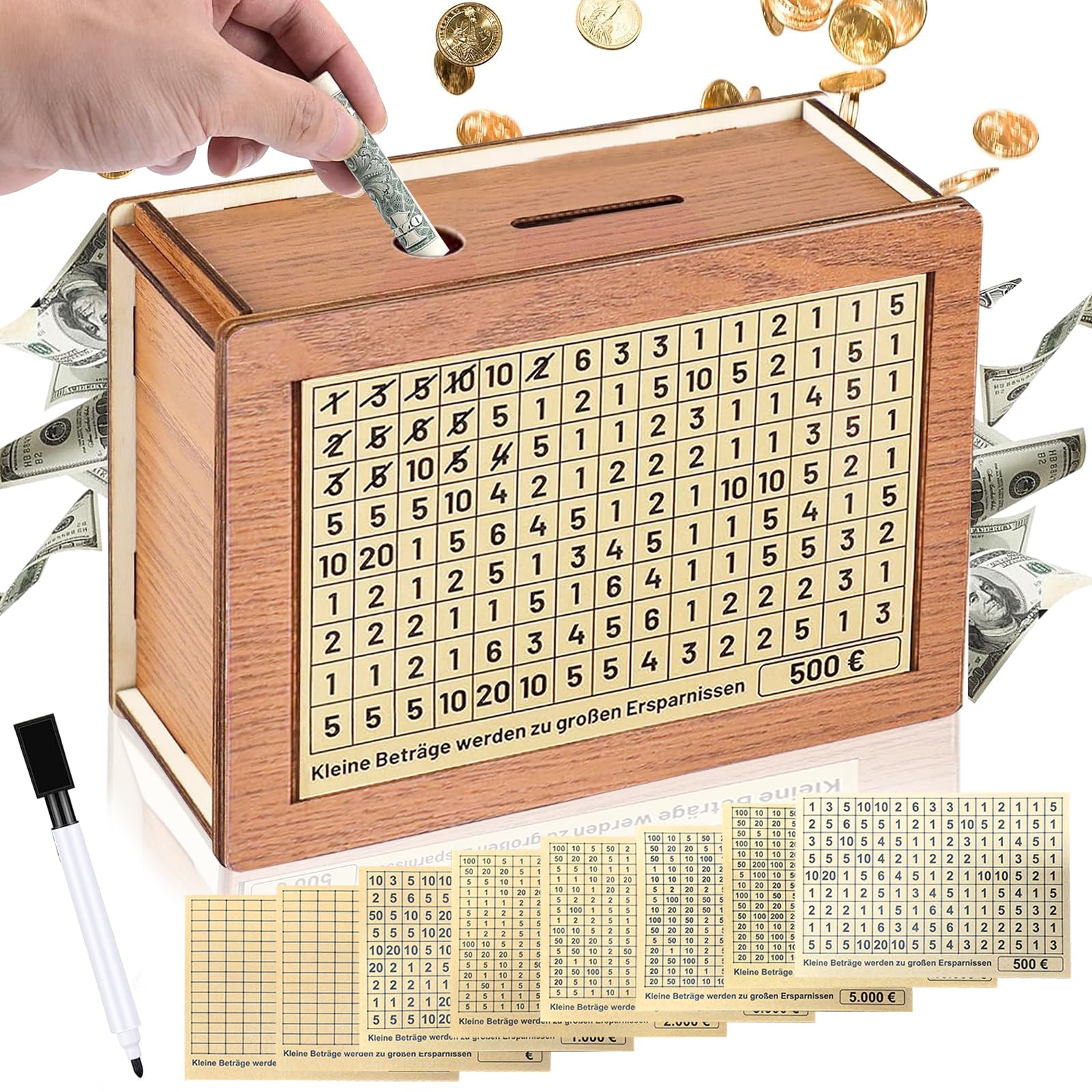 Hey, diese Spardose ist mal was ganz Anderes! Aus echtem Holz und mit nem cleveren Zähler-System. Du kannst dir Sparziele setzen - ob 1000€, 5000€ oder sogar 10.000€ - und dann jeden erreichten Betrag ankreuzen. Das coole: Sie ist wiederverwendbar! Mit dem wasserlöslichen Stift malst du deine Fortschritte auf die Acryltafel und wenn du das Ziel erreicht hast, wischst du einfach ab und fängst von vorne an. Super für Kinder um Spargewohnheiten zu lernen, aber auch für Erwachsene die sich mal was gönnen wollen. Einfach zusammenbauen - keine komplizierte Anleitung nötig. Sieht auch noch richtig schick aus auf dem Schreibtisch. Mit zwei Löchern für Münzen und Scheine. Einfach ein geniales Geschenk für jeden der sparen will!