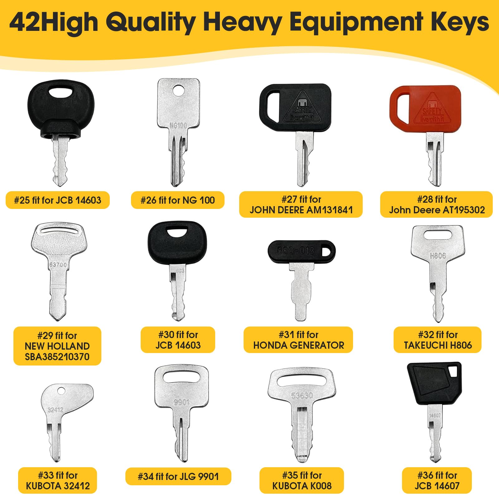 Das ultimative Schlüssel-Set für alle Baumaschinen-Besitzer! 42 verschiedene Zündschlüssel passend für Cat, Komatsu, Kubota, Hitachi, Takeuchi, Volvo, Bobcat und viele mehr. Inklusive 2 Ketten und 6 Schlüsselanhängern für perfekte Organisation. Aus hochwertigem technischen Kunststoff und Metall - hitzebeständig und langlebig. Nie wieder Ausfallzeiten wegen verlorener Schlüssel! Perfekt für Bagger, Radlader, Traktoren, Gabelstapler und andere schwere Maschinen. Das Set bietet dir eine praktische Backup-Lösung und erhöht die Sicherheit auf der Baustelle. Einfach den passenden Schlüssel aussuchen und die Maschine starten! Ein unverzichtbares Set für jede Werkstatt oder Baustelle - spart Zeit und Nerven!