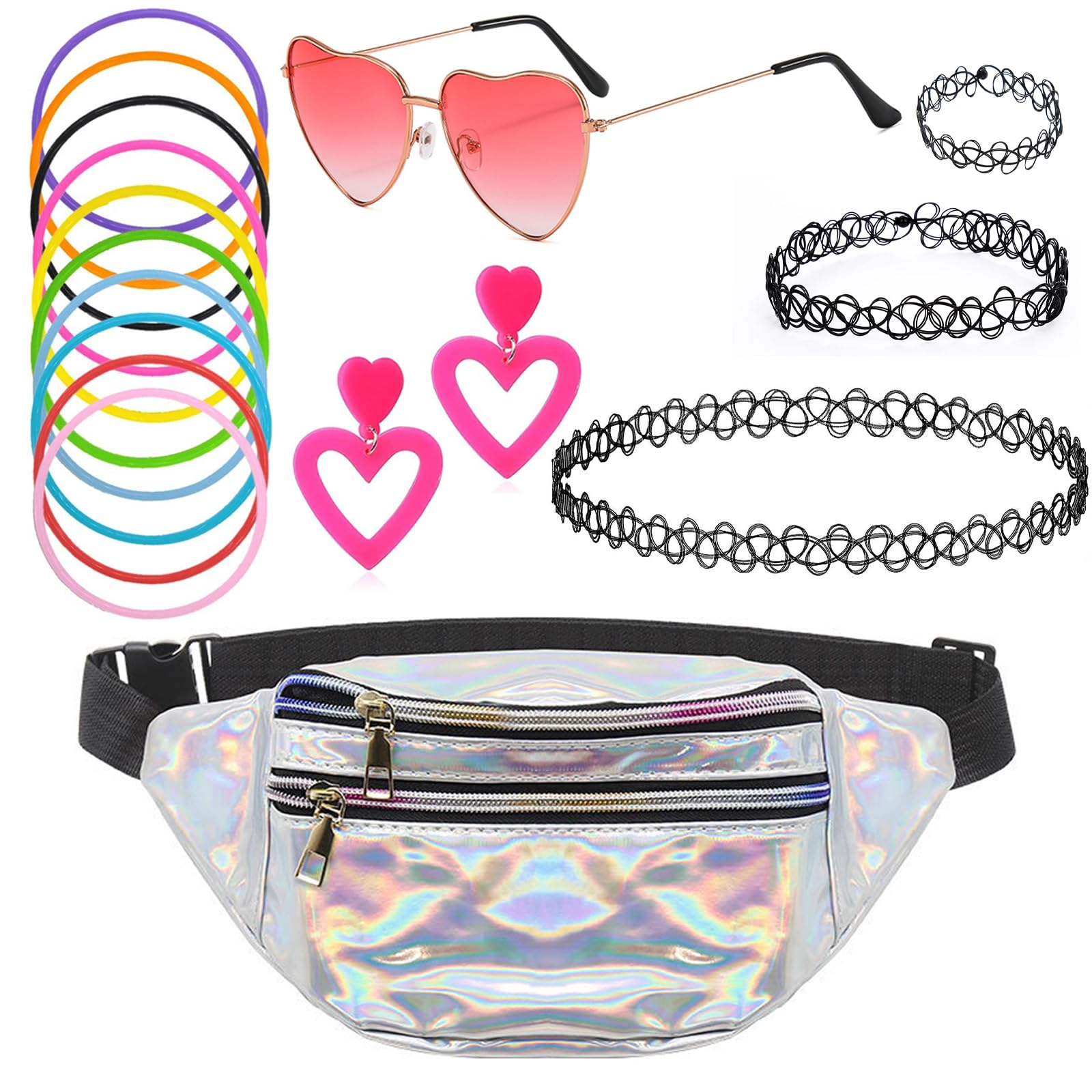 Back to the 90s! Dieses komplette Outfit-Set bringt den Retro-Chic zurück auf deine Party. Enthalten: pinke Sonnenbrille, rosane Bauchtasche, schwarzes Choker-Armband mit Ring und 10 neonfarbene Armbänder. Alles in knalligen Retro-Farben, die perfekt die 80er/90er Jahre einfangen. Die Bauchtasche ist nicht nur stylisch, sondern auch praktisch mit mehreren Fächern und wasserdichter Funktion. Perfekt für Mottopartys, Halloween, Abschlussbälle oder einfach für einen retro-trendigen Tag. Mach dich zur Queen der Party mit diesem auffälligen Set! Auch super für Yoga, Sport oder täglichen Gebrauch. Als Geschenk ideal für alle, die den Vintage-Look lieben. Hol dir den kompletten 90er Jahre Look in einem Set!