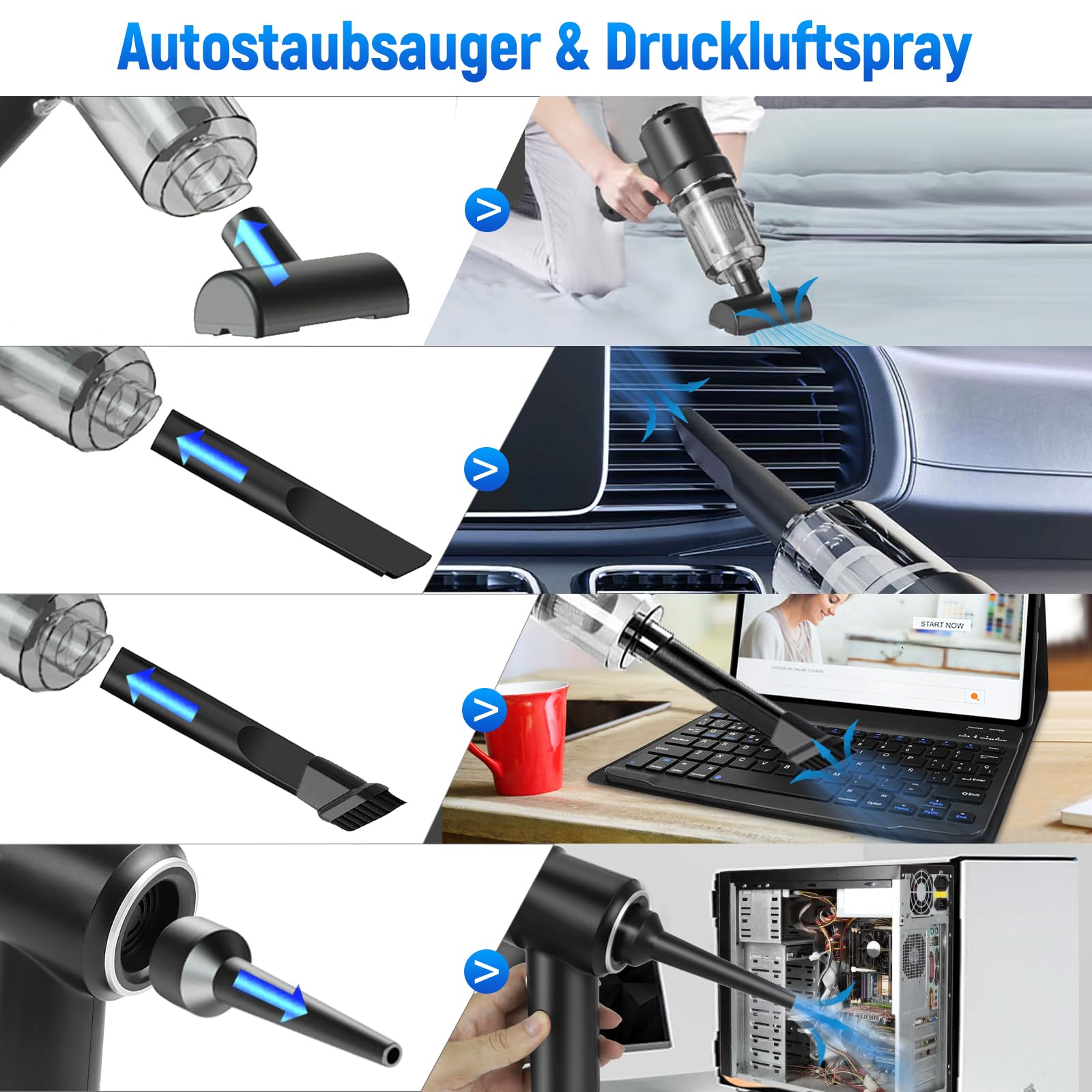 Endlich Ordnung ohne Kabelwirrwarr! Dieser praktische Handstaubsauger von Zabatoco mit 12000PA Saugkraft macht schnell sauber. Kabellos und wiederaufladbar per USB - überall einsetzbar! Mit 4-in-1 Funktionen: Staubsaugen, Blasen, Vakuumversiegeln und mehr. Der 0,2 Liter transparente Behälter zeigt dir, wann er voll ist. Mit waschbarem Filter - einfach reinigen und wiederverwenden. Bis zu 20 Minuten Laufzeit - perfekt für Auto, Küche, Büro oder Wohnung. Leicht und handlich - passt in jede Handtasche oder Autohandschuhfach. Mit verschiedenen Düsen für alle Ecken und Ritzen. Einfach aufladen und los saugen - so praktisch war Saubermachen noch nie!
