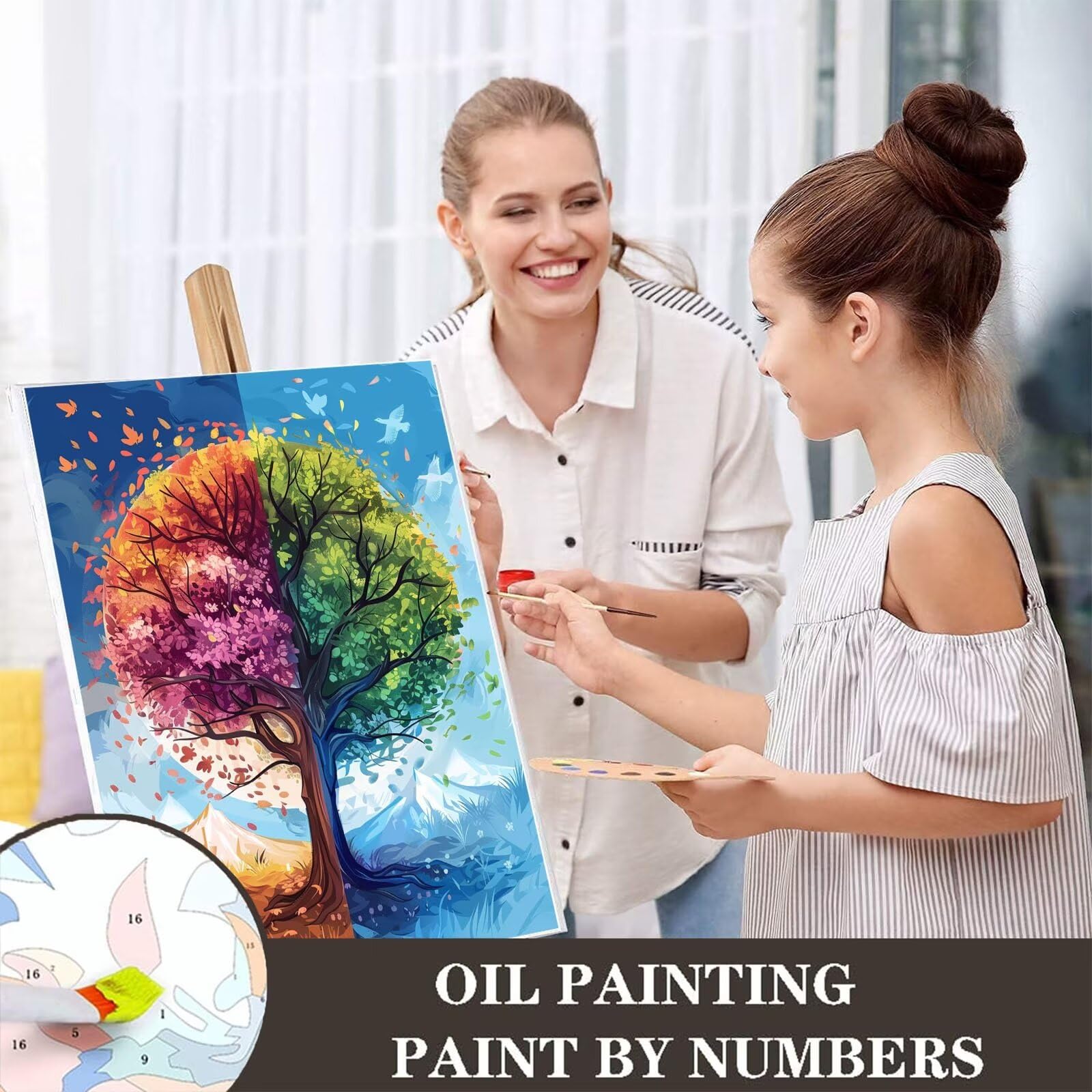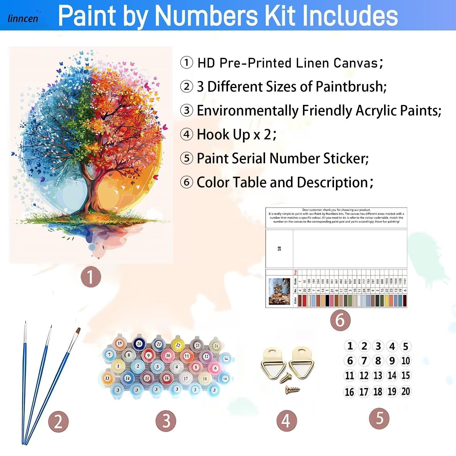 Hey, dieses Malen nach Zahlen Set ist perfekt zum Entspannen! Das Motiv 'Vier Jahreszeiten Baum' sieht später richtig professionell aus. Alles was du brauchst ist im Set enthalten: nummerierte Leinwand (35x50cm), Acrylfarben in kleinen Töpfen und 3 verschiedene Pinsel. Einfach die Felder mit den entsprechenden Farben ausmalen - wie von Zauberhand entsteht ein wunderschönes Bild! Super für Anfänger und Fortgeschrittene. Perfekt für gemütliche Abende, zur Entspannung nach der Arbeit oder als gemeinsames Projekt mit Freunden. Wenn du fertig bist, kannst du das Bild aufhängen - es macht sich super in Wohnzimmer, Schlafzimmer oder Büro. Auch ein tolles Geschenk für kreative Menschen!