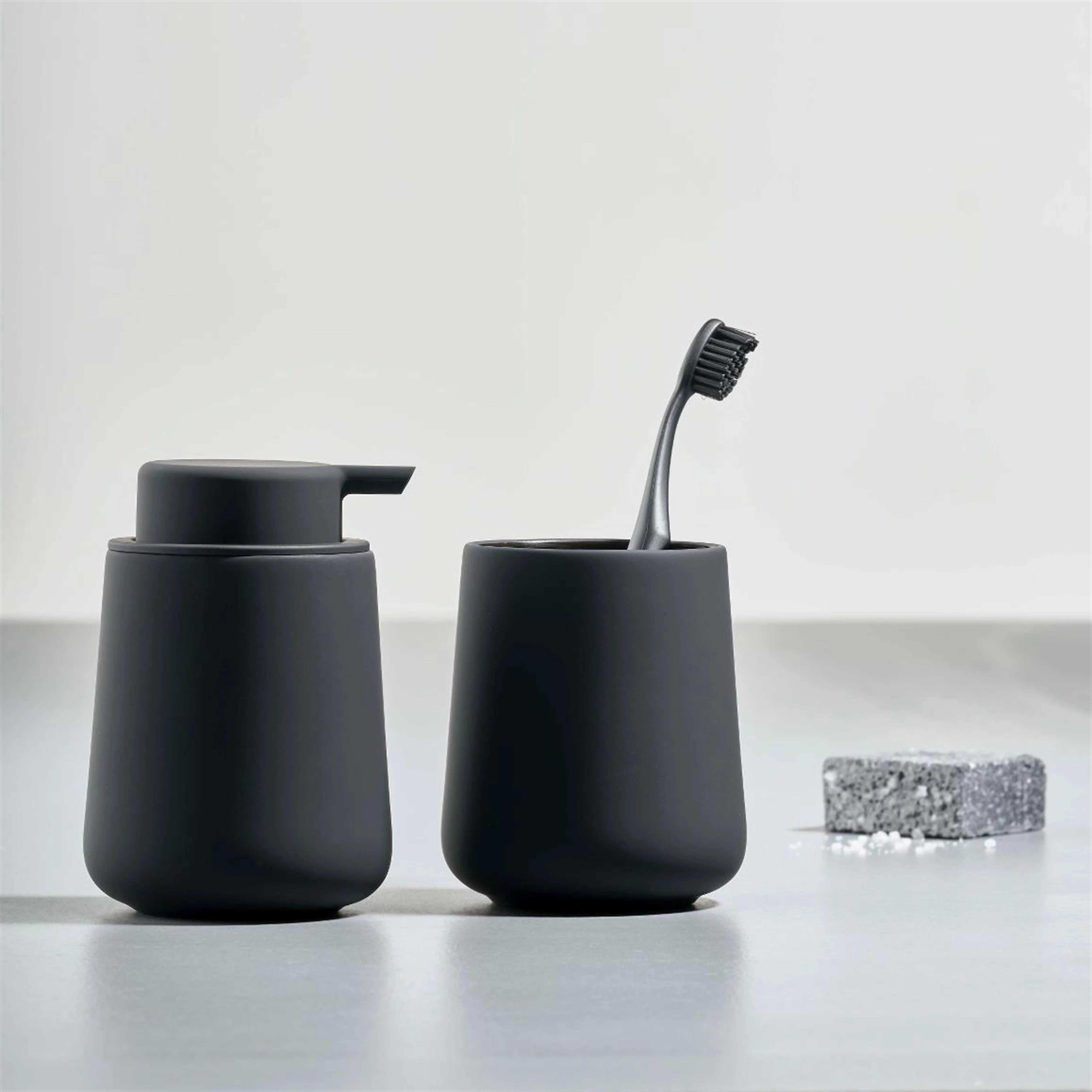 Dieser Zahnbürstenbecher macht dein Badezimmer sofort stylischer! In einem modernen petrol green mit weicher Soft-Touch-Oberfläche fühlt er sich nicht nur edel an, sondern liegt auch super in der Hand. Perfekt für alle, die Wert auf Ästhetik im Bad legen.\n\nMit ca. 9 cm Höhe und 7,5 cm Durchmesser ist er kompakt genug für jedes Waschbecken, bietet aber trotzdem Platz für mehrere Zahnbürsten. Das Fassungsvermögen von 230 ml reicht völlig aus und die Reinigung ist denkbar einfach - einfach mit milden Reinigern abwischen.\n\nAus hochwertigem Porzellan gefertigt, gehört dieser Becher zur SOFT-Serie von Zone Denmark, zu der es auch passende Seifenspender und Toilettenbürsten gibt. Ein echtes Upgrade für dein Badezimmer!\n\n• Maße: 9cm hoch, 7,5cm Durchmesser\n• Aus Porzellan mit Soft-Touch-Beschichtung\n• Fassungsvermögen: 230 ml\n• Farbe: petrol green\n• Leicht zu reinigen mit milden Mitteln