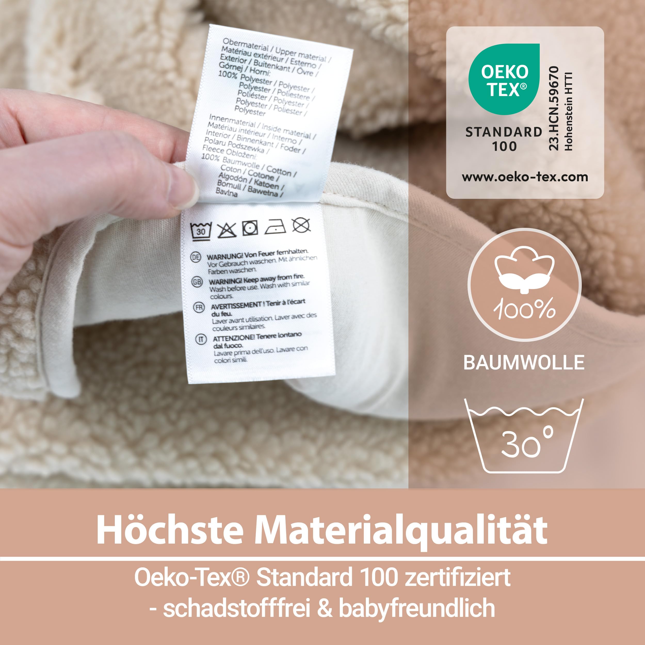 Ach ja, und keine Sorge wegen der Haut deines Babys: Die Decke ist OEKO-TEX zertifiziert (Prüfnummer: 23.HCN.59670) und damit total unbedenklich. Macht auch die Waschmaschine mit - einfach bei 30°C waschen.