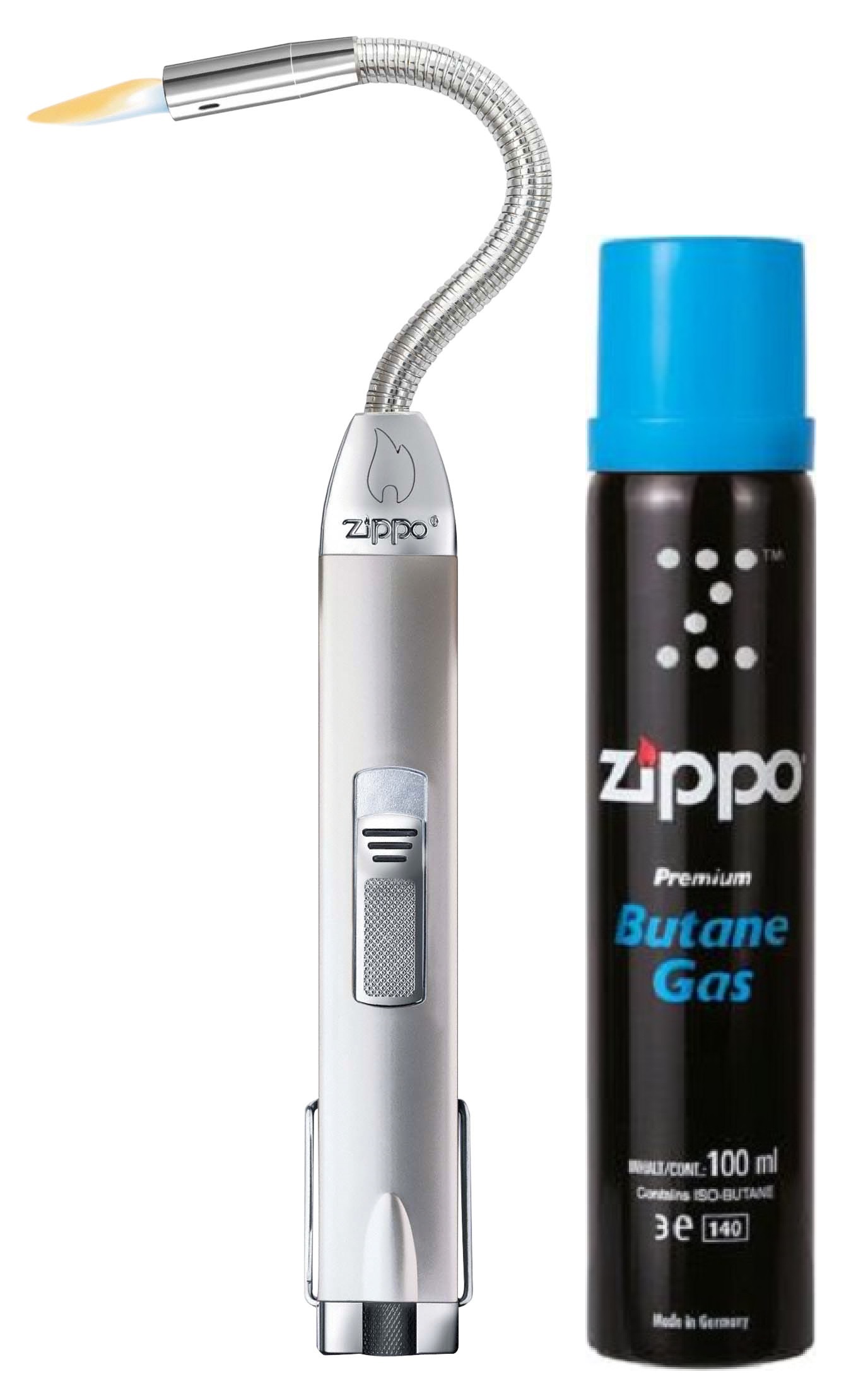 Mit diesem Zippo Stabfeuerzeug mit flexiblem Hals erreichst du auch die hintersten Kerzen mühelos! Das elegante Satin Silber Gehäuse liegt perfekt in der Hand und überzeugt durch seine hochwertige Verarbeitung. Der lange, biegsame Hals lässt sich in alle Richtungen bewegen - ideal für tiefe Kerzengläser, Grillanzünder oder schwer zugängliche Stellen. Die windfeste Doppelflamme brennt auch bei Zugluft zuverlässig und das Feuerzeug ist einfach mit Butangas nachfüllbar. Der praktische Sicherheitsknopf verhindert unbeabsichtigtes Zünden, was es besonders familienfreundlich macht. Jedes Zippo wird in den USA hergestellt und trägt einen individuellen Datumscode - ein Zeichen für Qualität und Handwerkskunst. Und natürlich darf der legendäre Zippo-Klick nicht fehlen! Perfekt für Haushalt, Garten, Camping oder als stilvolles Accessoire für alle, die Wert auf Qualität und Funktionalität legen.