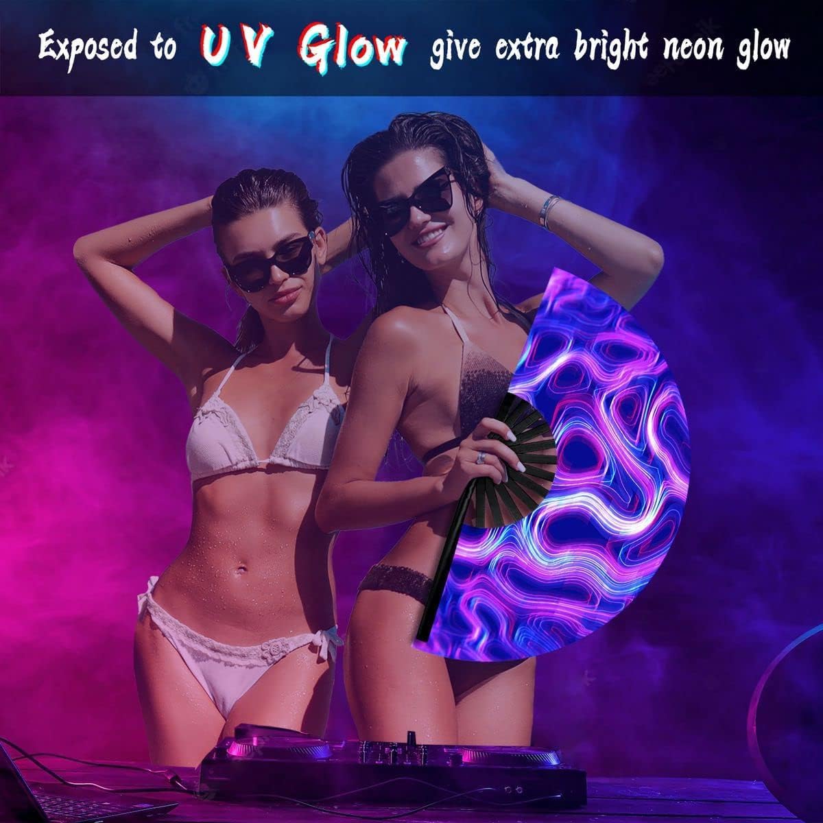 Aus natürlichem Bambus und UV-leuchtendem Nylon - unter Schwarzlicht ein absoluter Hingucker! Macht das typische Klack-Geräusch beim Öffnen - perfekt für den Beat. Tagsüber stylischer Accessoire, nachts leuchtendes Party-Highlight. Ideal für EDM, Raves, Konzerte oder Tanzen. Leicht und faltbar - passt in jede Tasche. Auch als Deko fürs Zimmer oder als besonderes Geschenk super geeignet. Mach dich bereit für unvergessliche Party-Nächte!