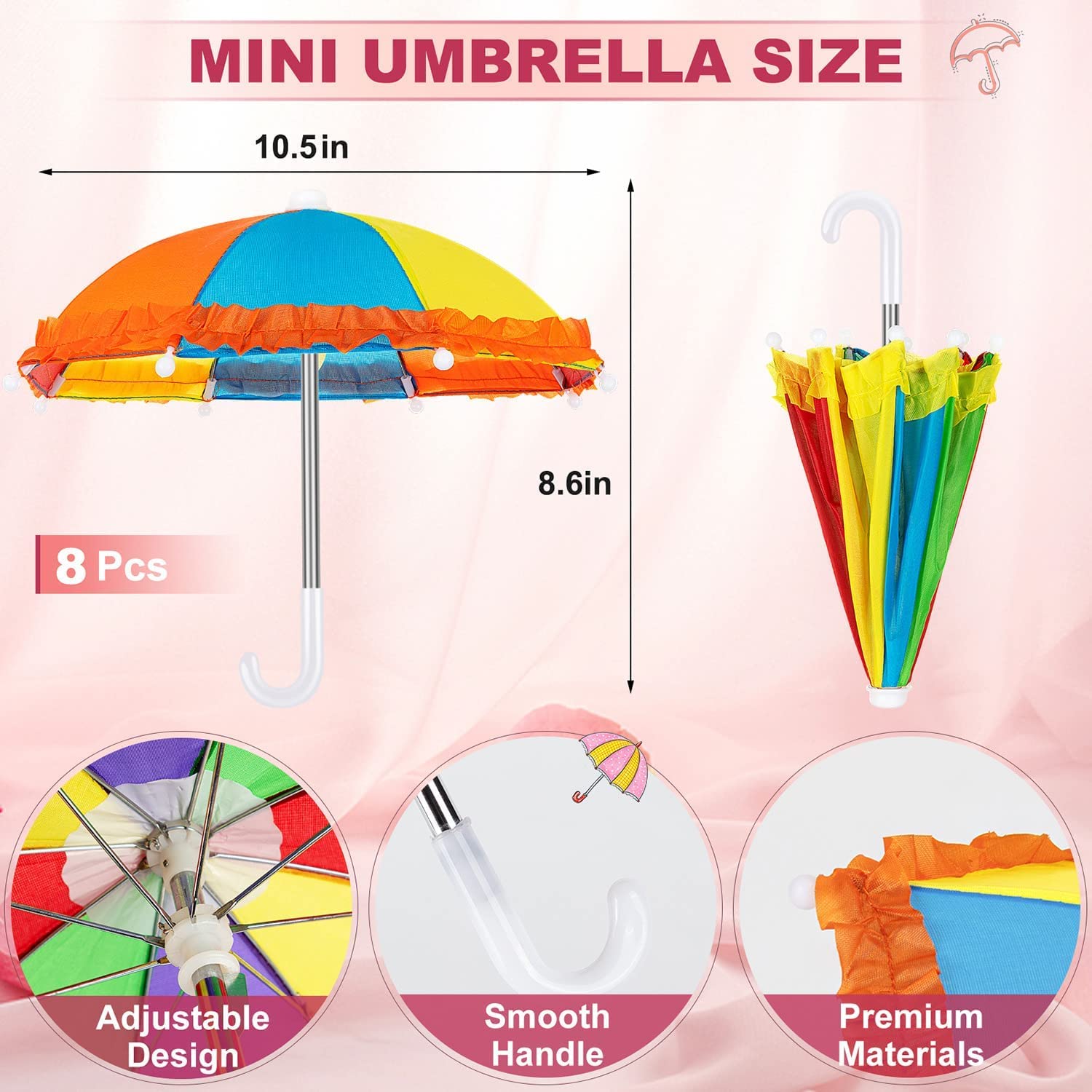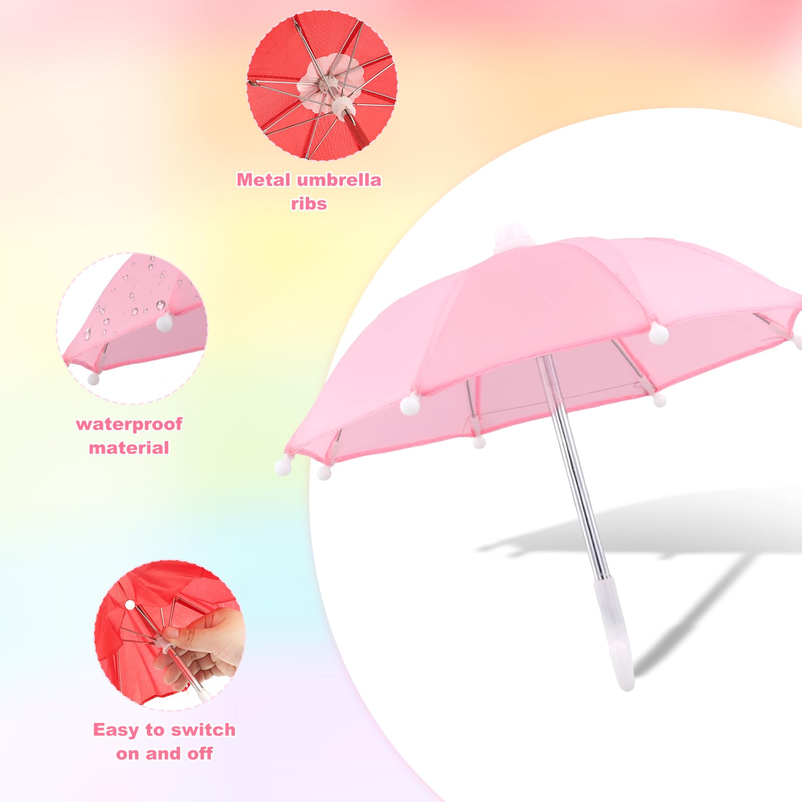 Wie süß sind denn diese Mini-Regenschirme! Im Set bekommst du 4 Stück in den Farben Lila, Himmelblau, Gelb und Rosa - perfekt für Puppen, Puppenhäuser oder als Deko. Zusammengeklappt sind sie nur 22cm lang, aufgeklappt haben sie 28cm Durchmesser - ideal für die meisten Puppen. Die Schirme sind aus hochwertigem Nylon mit Kunststoff-Speichen und Metall-Griff - robust und langlebig. Kinder können sie immer wieder auf- und zuklappen. Super nicht nur fürs Puppenspiel, sondern auch als Deko für Geburtstagsfeiern, als Requisiten für kreative Fotos, für Reisekoffer-Landschaften oder um Topfpflanzen aufzuhübschen. Die bunten Farben machen sofort gute Laune! Perfekt als Geschenk für Kinder, als Belohnung oder für Bastelfreunde. Einfach auspacken und sofort losspielen - deine Puppen sind jetzt perfekt für regnerische Tage gerüstet!