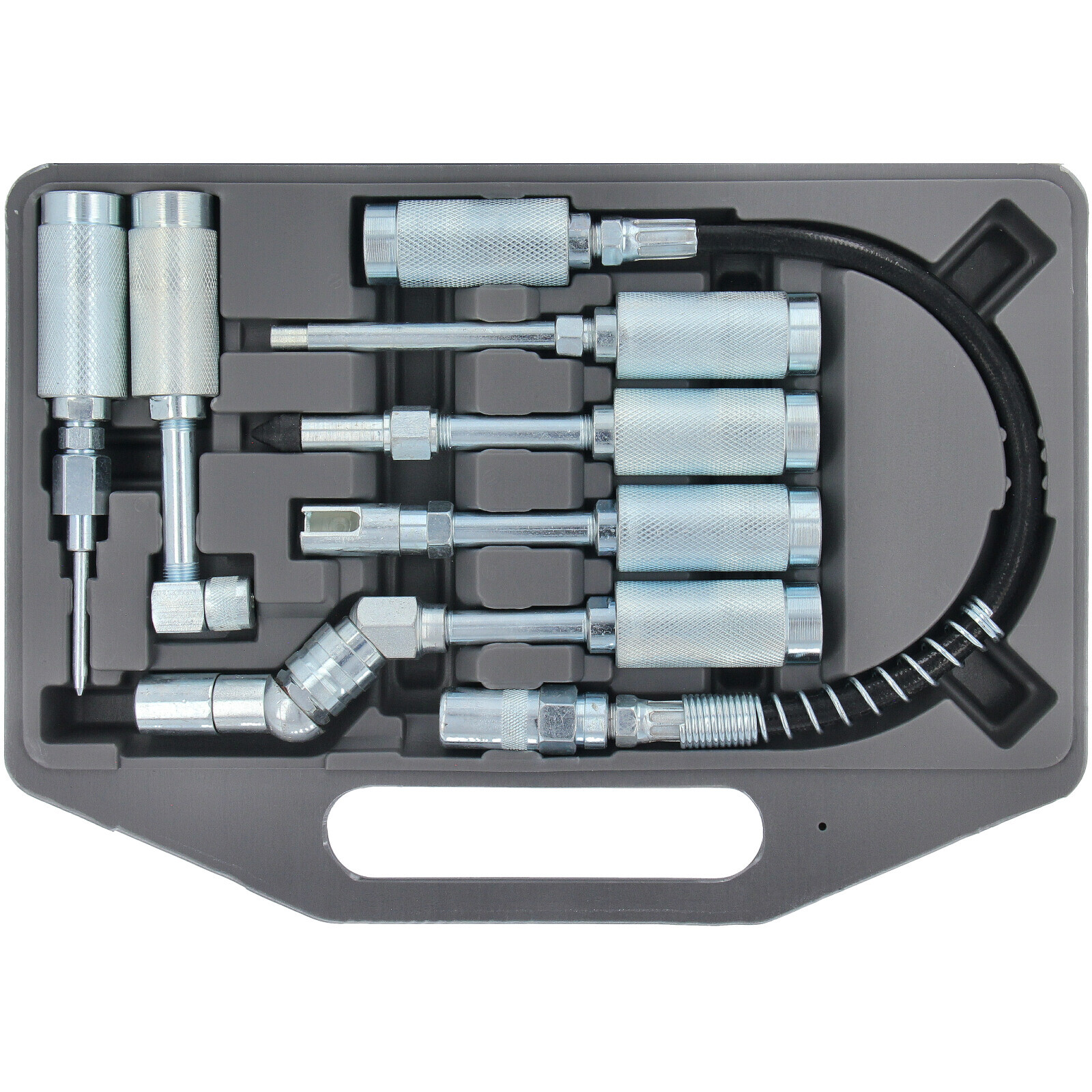 Professionelles Schmier-Zubehör für deine Fettpresse! Dieses 7-teilige Set von SW-Stahl enthält alles, was du für eine perfekte Schmierung brauchst. Dabei sind: ein 90° Schmiermittel-Aufsatz für schwer erreichbare Stellen, eine gerade Verlängerung für standard Anwendungen, eine 300mm Schlauchverlängerung für mehr Reichweite, ein 90° Adapter für winklige Positionen, eine gummi-beschichtete Schmierspitze zum Schutz empfindlicher Bauteile, eine Nadelspitze für präzises Arbeiten und ein 360° Adapter für maximale Flexibilität. Made in Germany - Qualität, auf die du dich verlassen kannst! Ob für die Werkstatt, die Industrie oder den ambitionierten Hobby-Schrauber - mit diesem Set bist du für jede Schmieraufgabe bestens gerüstet. Einfach auf die Fettpresse aufstecken und loslegen. So geht Wartung heute - professionell, sauber und effizient!
