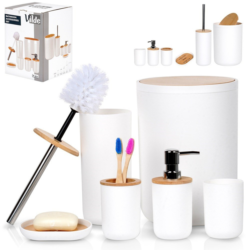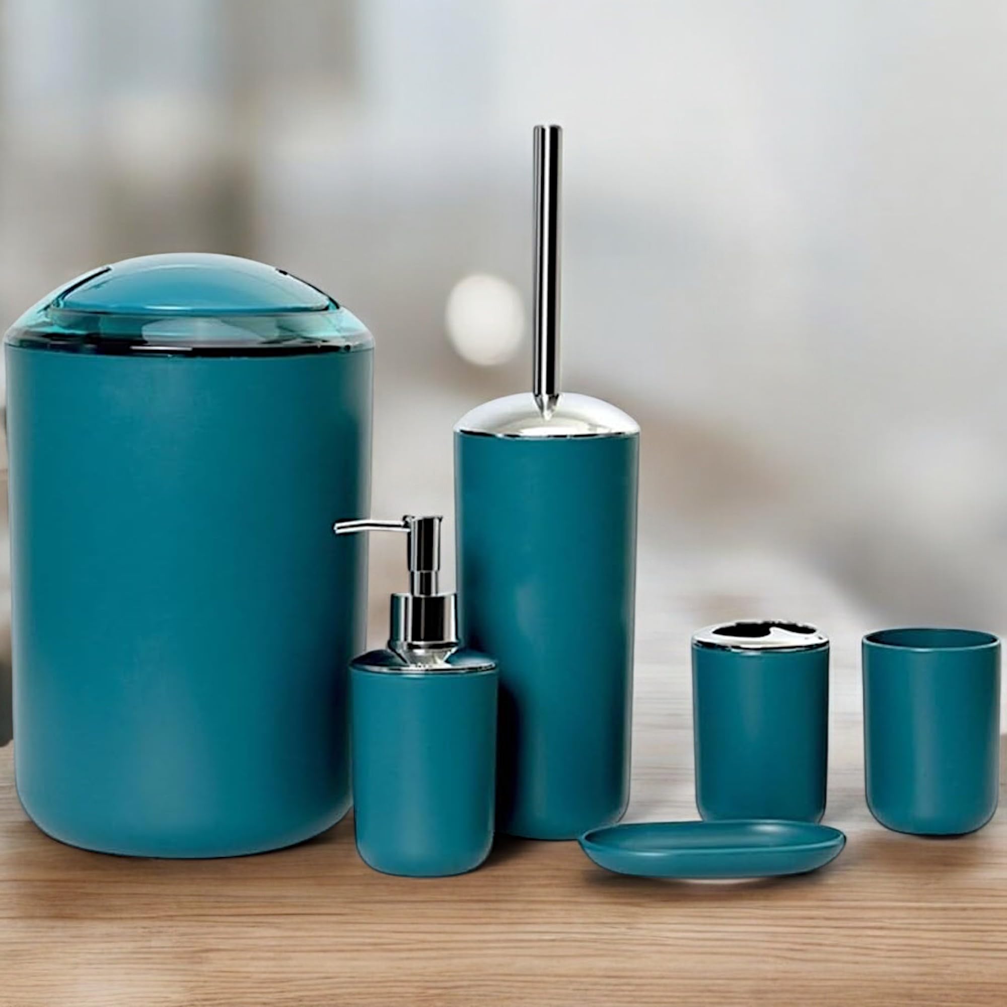 Willst du dein Badezimmer mal so richtig auf Vordermann bringen? Dieses 6-teilige Badset in Türkis bringt Ordnung und Style in dein Bad! Im Set enthalten sind: Eine Tasse, ein Zahnbürstenhalter, ein Seifenspender, eine Händedesinfektionsflasche, ein Mülleimer und eine Toilettenbürste. Alles aus robustem Plastik, das lange hält und super pflegeleicht ist. Das moderne Design passt zu fast jedem Badezimmer-Stil - ob zu Hause, im Hotel oder im Büro. Endlich keine herumstehenden Zahnbürsten und unordentlichen Seifenstücke mehr! Alles hat seinen festen Platz und sieht dabei noch richtig gut aus. Auch als Geschenk eine super Idee - wer freut sich nicht über ein hübsches und praktisches Badset? Einfach aufstellen und sich über das aufgeräumte Badezimmer freuen!