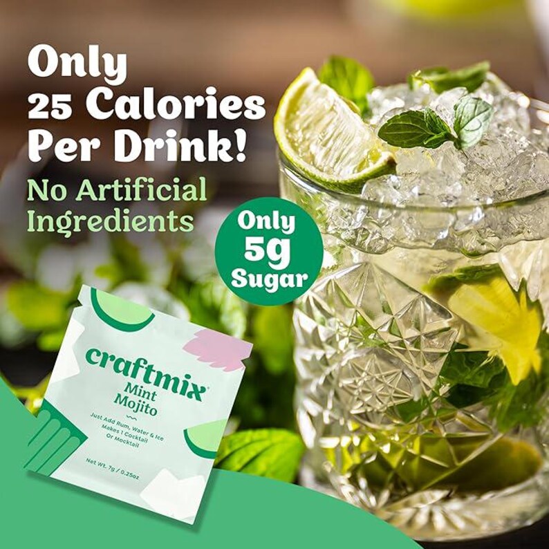 Hey, Lust auf nen leckeren Mojito, aber keine Lust auf aufwändiges Mixen? Mit Craftmix Mint Mojito geht's ratzfatz! Einfach ein Päckchen in ein Glas, nen Schuss Rum dazu (oder weglassen für nen Mocktail), 3 Unzen Wasser rein, umrühren - fertig! Und das Beste: Nur 25 Kalorien pro Drink, zuckerfrei, vegan und ohne künstliche Zutaten! Hergestellt mit echtem dehydriertem Limettensaft für authentischen Geschmack. Perfekt für Partys, Grillabende, Camping oder einfach als Feierabend-Drücker. Die einzelnen Portionsbeutel sind super praktisch für unterwegs. Deine Gäste werden begeistert sein, und du musst nicht ewig in der Küche stehen! Auch toll als Geschenk für Cocktail-Fans. Probier's aus - so einfach war Mojito machen noch nie!