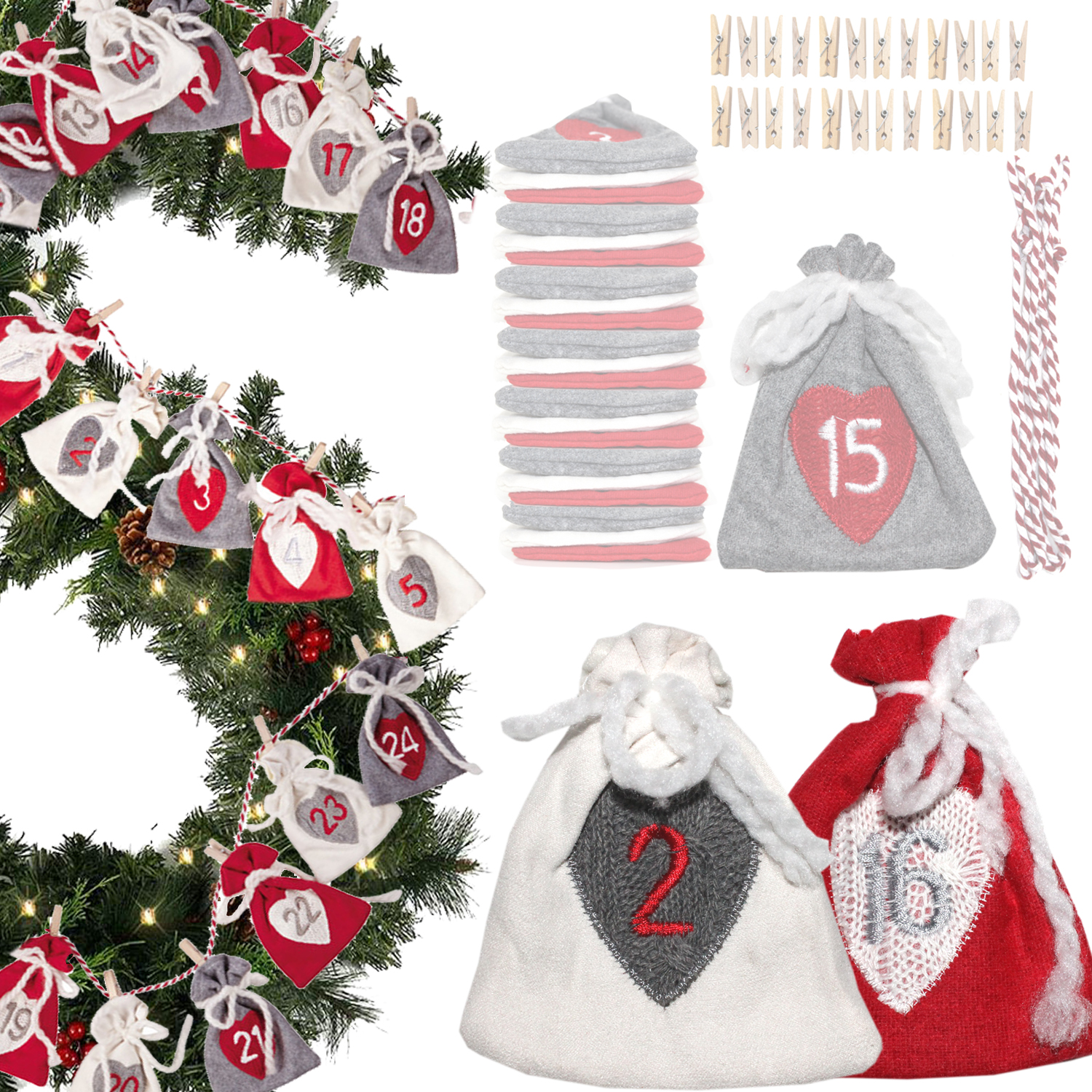 Im Lieferumfang sind alles dabei: 24 Jute-Säckchen, 24 Holzklammern und 10 Meter Hanfseil zum Aufhängen. Einfach die Säckchen befüllen, mit den Klammern verschließen und an der Leine aufhängen - fertig ist die persönliche Adventsüberraschung!
