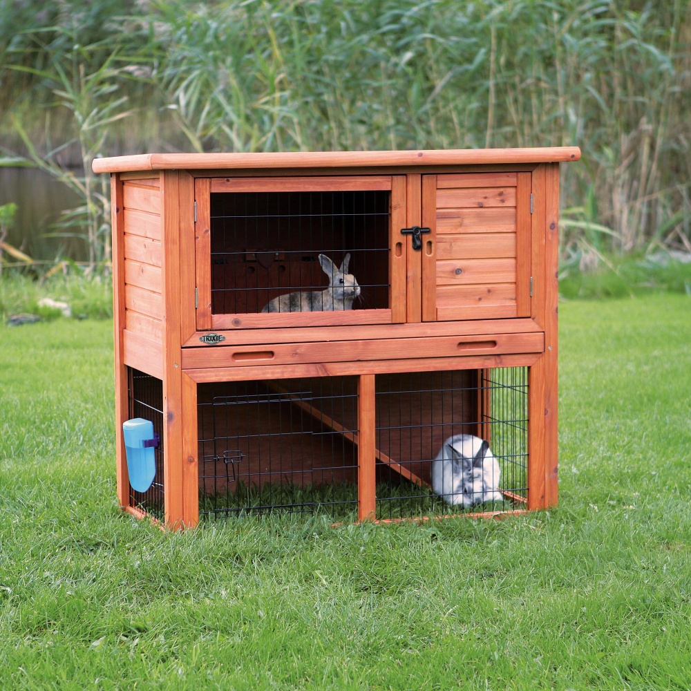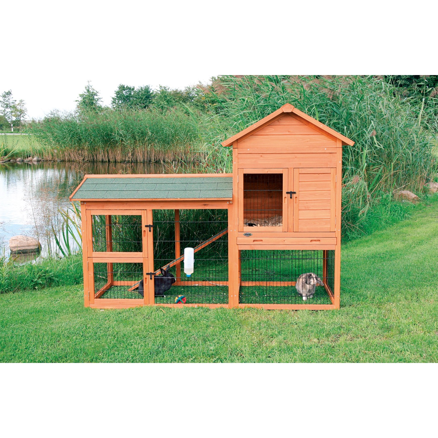 Dieser Trixie Kleintierstall ist ein richtiges Luxusheim für Deine kleinen Lieblinge! Zweistöckig mit integriertem Freilaufgehege - was will man mehr? \\n\\nAus lasiertem Kiefernholz mit besandeter Dachpappe und stabilen Metallgittern. Der enge Gitterabstand von nur 2 cm ist perfekt für die Aufzucht von Jungtieren. \\n\\n• Zweistöckiges Design \\n• Mit Freilaufgehege \\n• 7 Türen für einfache Reinigung \\n• Enge Gitter (2 cm Abstand) \\n• Aus Kiefernholz \\n\\nMit Rückzugsmöglichkeit, Schiebetür und verschließbarer Bodenluke. Eine Dachhälfte bietet zusätzlichen Stauraum. \\n\\nDeine Kaninchen, Meerschweinchen oder anderen Nager werden dieses tolle Zuhause lieben! Einfach aufbauen und tierisches Glück genießen.