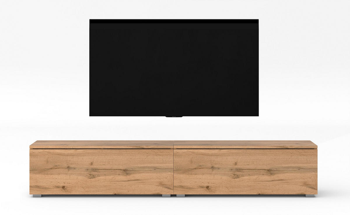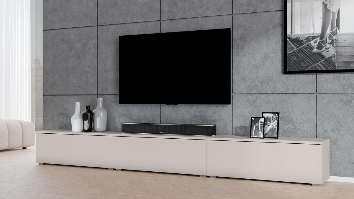 Wow, dieses AXLIVING Loriano Lowboard bringt richtig Style in dein Wohnzimmer! Mit 200 cm Breite (besteht aus zwei 100 cm Schränken) bietet es mega viel Stauraum für deine gesamte Unterhaltungselektronik.\n\nDie wunderschöne beige Kaschmir-Optik wirkt modern und warm zugleich. Besonders cool: Die grifflosen Fronten mit Push-to-Click-Technologie! Einfach leicht drücken und die Türen öffnen sich sanft nach unten - total lautlos und stylisch.\n\nInnen verstecken sich vier geräumige Fächer für Receiver, Spielekonsolen, Blu-ray-Player und alles andere. Aus kratzfesten, laminierten Materialien - super pflegeleicht und langlebig.\n\nDie Maße von 200x34x32 cm (BxHxT) passen perfekt unter die meisten Flachbildfernseher. Lieferung in zwei Paketen mit Montageanleitung - alles dabei, nur Dübel je nach Wand musst du selbst besorgen.\n\nFür alle, die value auf modernes Design und praktischen Stauraum legen. Sieht aus wie teure Designer-Möbel, ist aber erschwinglich - was will man mehr?