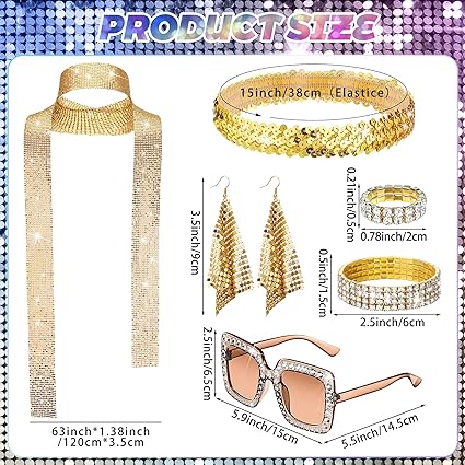 Yay, Disco-Feeling! Dieses 7-teilige Set von SAIIURV bringt den Glamour der 70er und 80er direkt zu dir. Enthalten: 1 glitzernde Strass-Sonnenbrille, 1 Paar auffällige Disco-Ohrringe, 1 langer funkelnder Schal, 1 Bling-Bling-Haarband und 2 Armband. Alles in Gold - da wirst du zum absoluten Hingucker auf jeder Party! Perfekt für Disco-Nächte, Karneval, Halloween, Festivals oder als Fotorequisite. Die Materialien sind hochwertig und comfortable: Die Armbänder mit Gummiband aus Legierung und Strass, die Sonnenbrille aus PC-Material. Einfach anziehen und los geht's! Mit den schillernden Strasssteinen funkelt und glänzt du unter den Lights - im Mittelpunkt stehst du garantiert. Ob zum Retro-Outfit oder als Ergänzung für dein Kostüm: Mit diesem Set machst du nichts verkehrt. Also, schnapp es dir und tanze die Nacht durch!