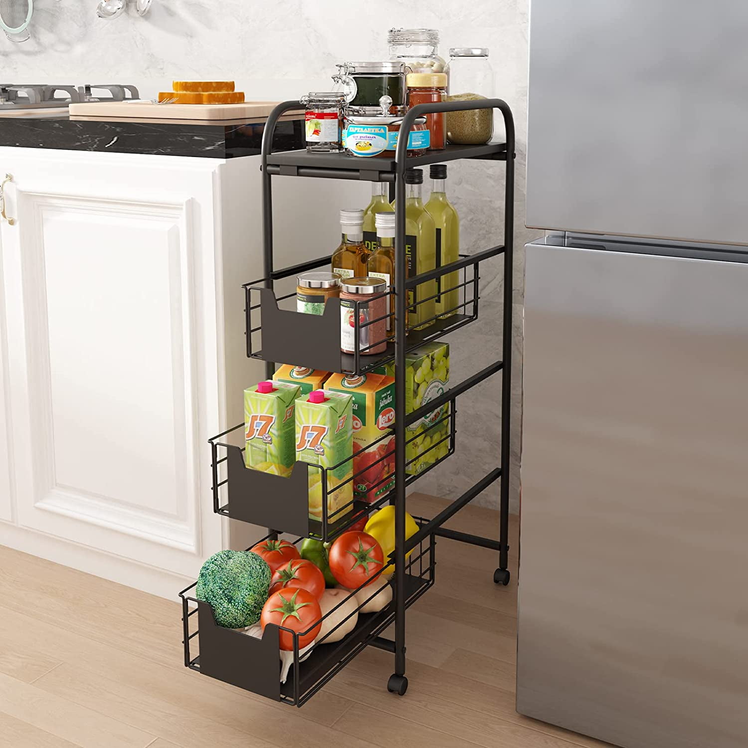 Ordnung für schmale Räume! Dieser 4-stöckige Rollwagen ist der absolute Platzwunder. Nur 25 cm breit - passt auch in die engste Ecke. Maße: 25x37x105 cm - ideal für Badezimmer, Küche oder als Wäschekorb. Mit 4 schwenkbaren Rädern (2 blockierbar) - einfach hin- und herrollen wo du willst. Die Mesh-Körbe sind atmungsaktiv, wasserfest und super pflegeleicht. Inklusive 4 Seitenhaken für Handtücher, Löffel oder Bürsten. Aus stabilem Kunststoff - hält was aus! Perfekt für Putzzeug, Kosmetik, Snacks oder Bürobedarf. Einfach in 10 Minuten zusammengebaut - ohne Werkzeug. Schwarz - passt zu jedem Einrichtungsstil. Endlich Ordnung in kleinen Räumen - dieser Wagen ist dein bester Freund!