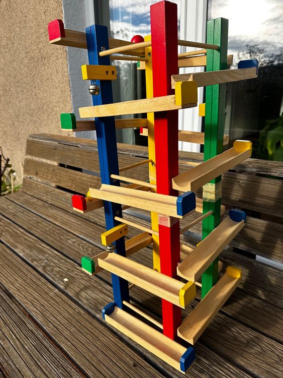 Farbenfroher Spielspaß für kleine Entdecker! Diese Kugelbahn mit Klangeffekten begeistert Kinder ab 3 Jahren. 6 bunte Ebenen, 10 Regenbogenbälle. 🌈